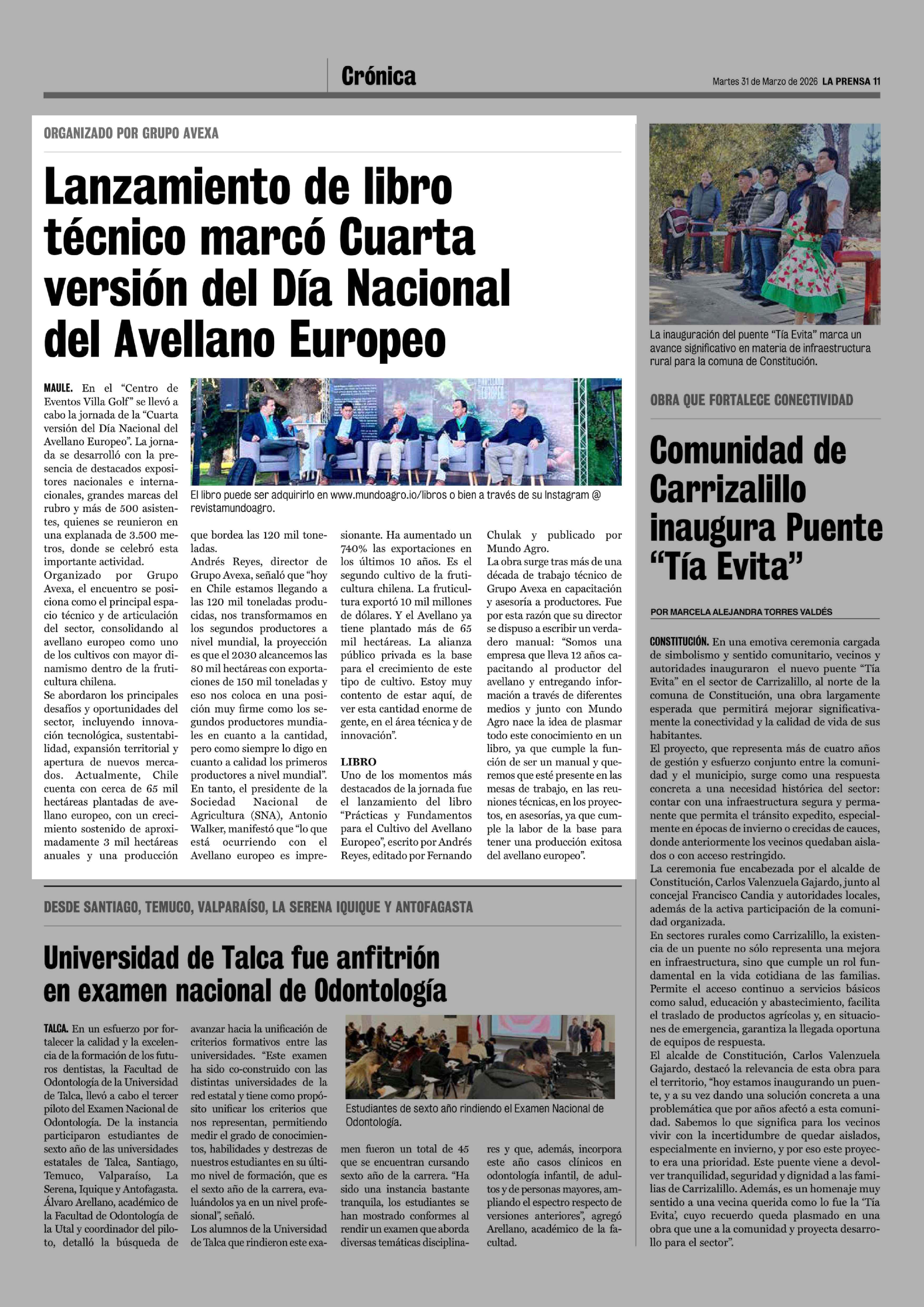 Lanzamiento de libro técnico marcó Cuarta versión del Día Nacional del Avellano Europeo 31-03-2026 La Prensa de Curicó |