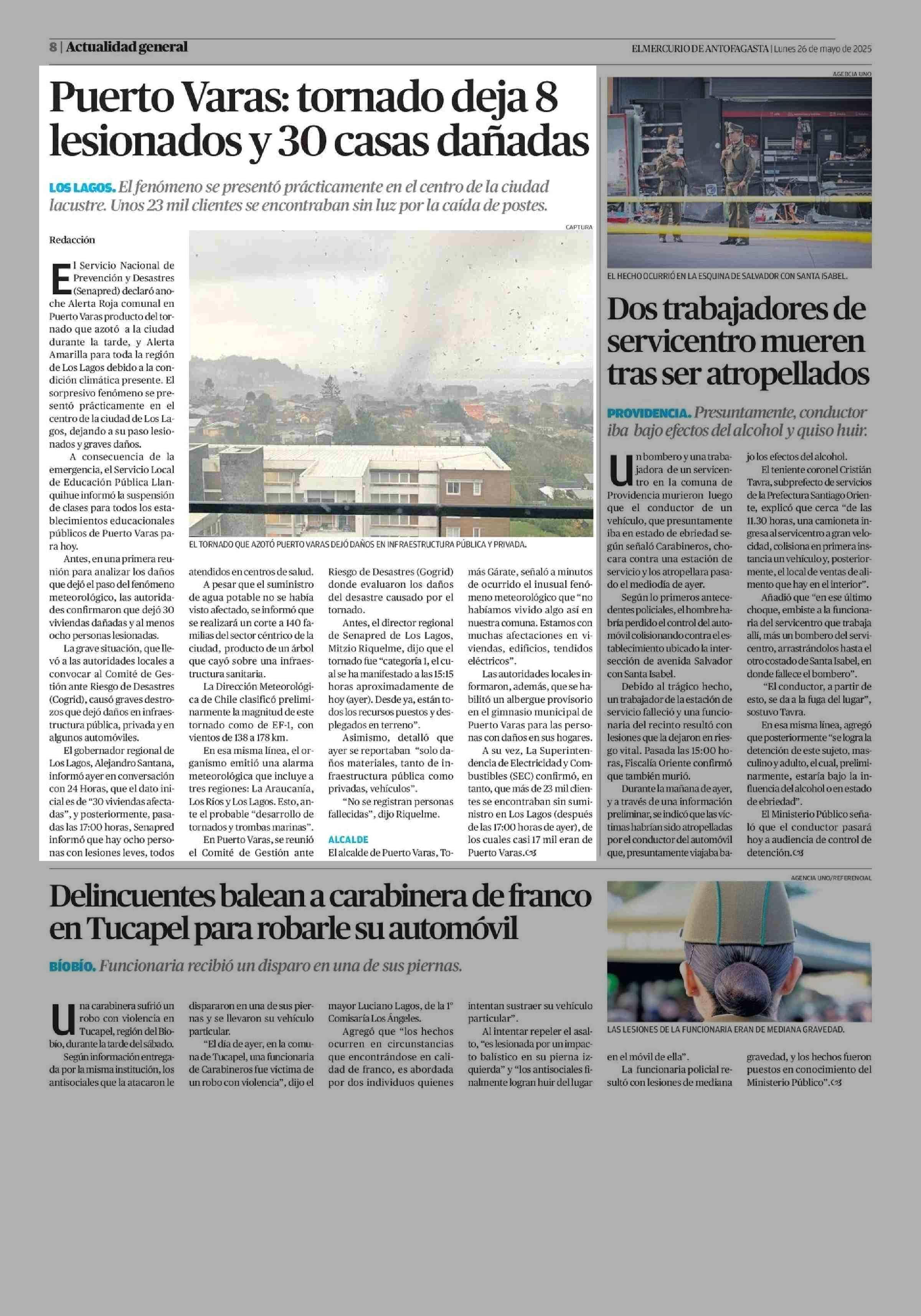 Puerto Varas: tornado deja 8 lesionados y 30 casas dañadas 26-05-2025 El Mercurio de Antofagasta |