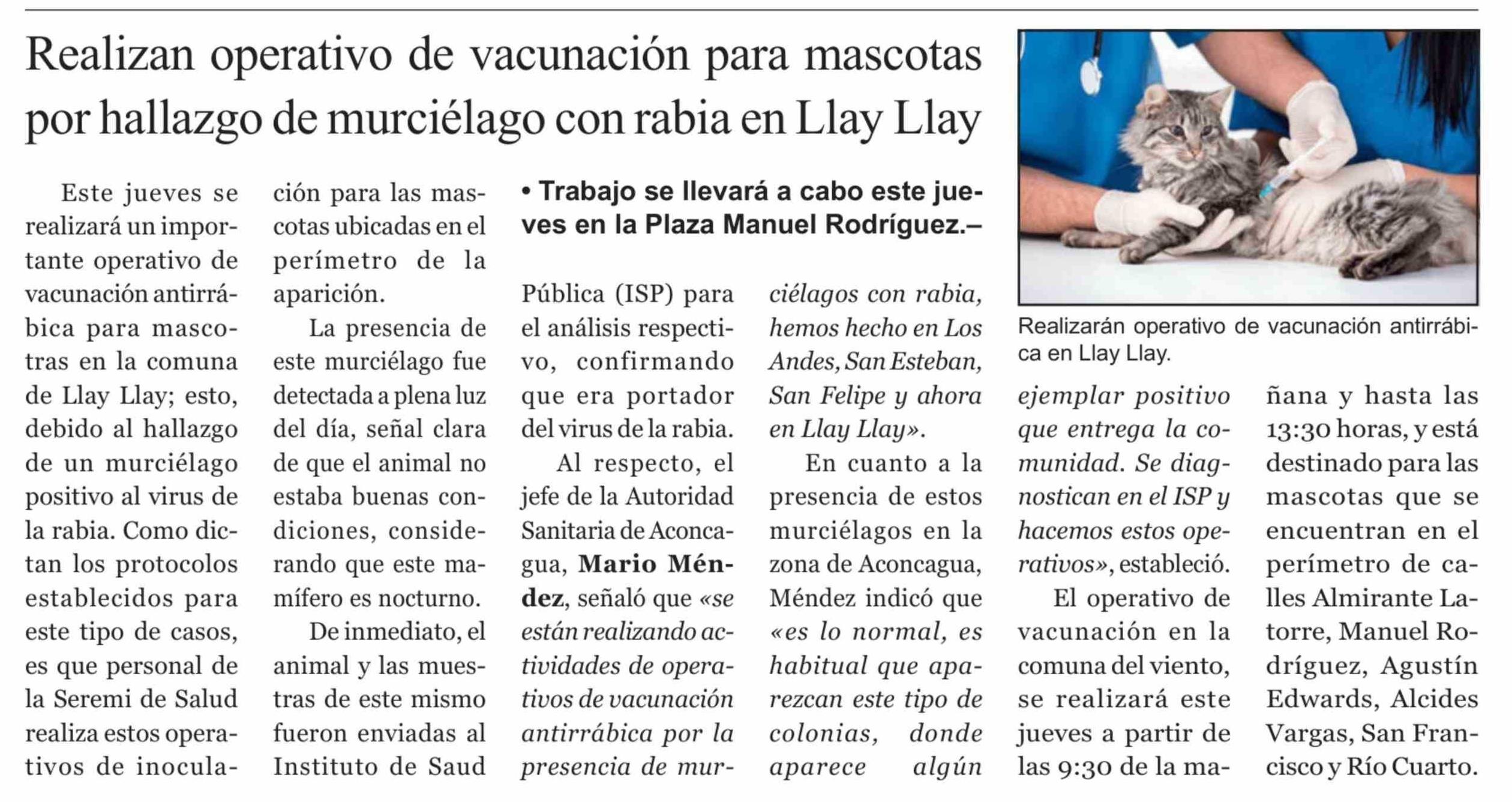 Título: Realizan operativo de vacunación para mascotas por hallazgo de murciélago con rabia en Llay Llay