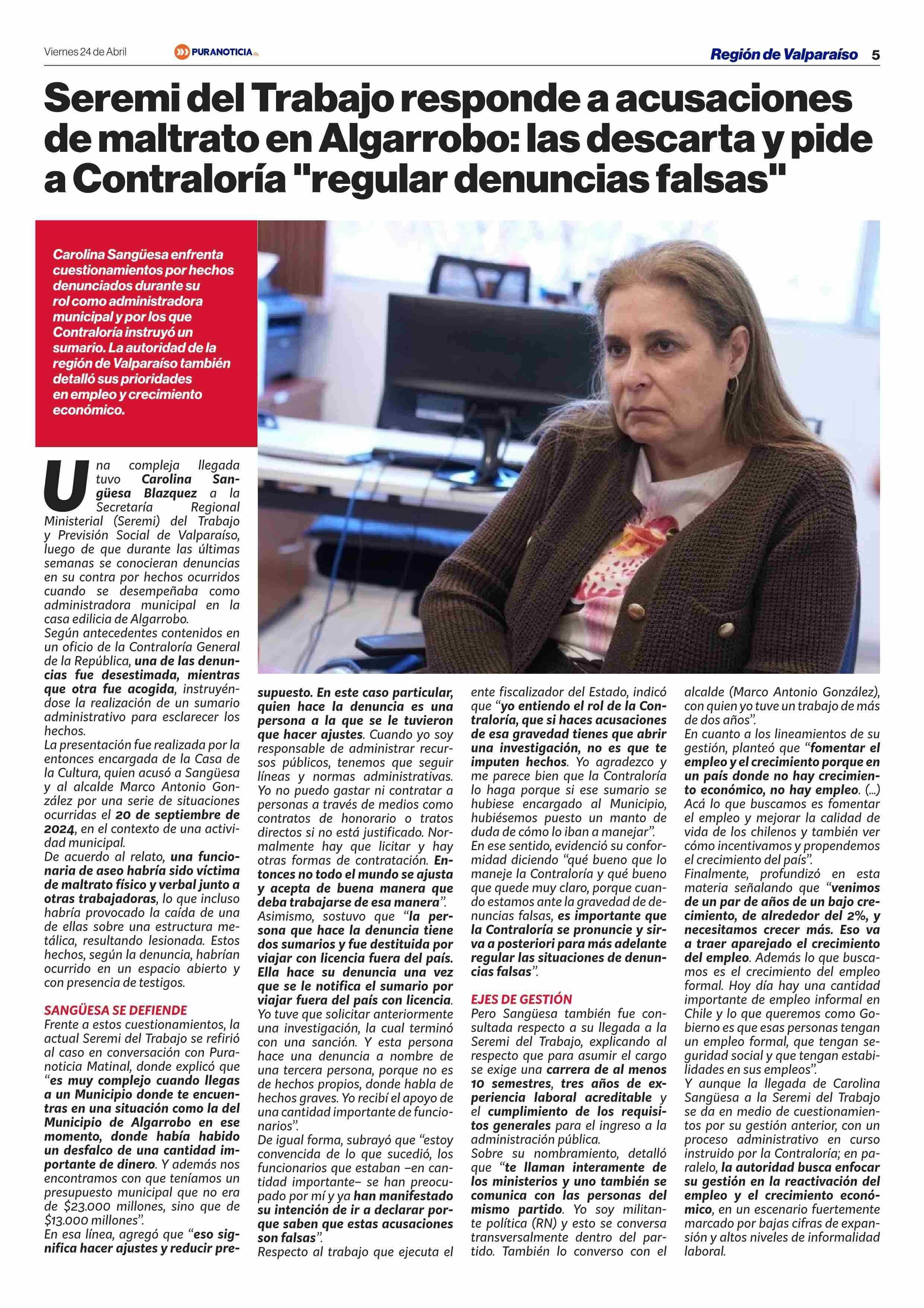 Seremi del Trabajo responde a acusaciones de maltrato en Algarrobo: las descarta y pide a Contraloría "regular denuncias falsas" 24-04-2026 Puranoticia.cl |