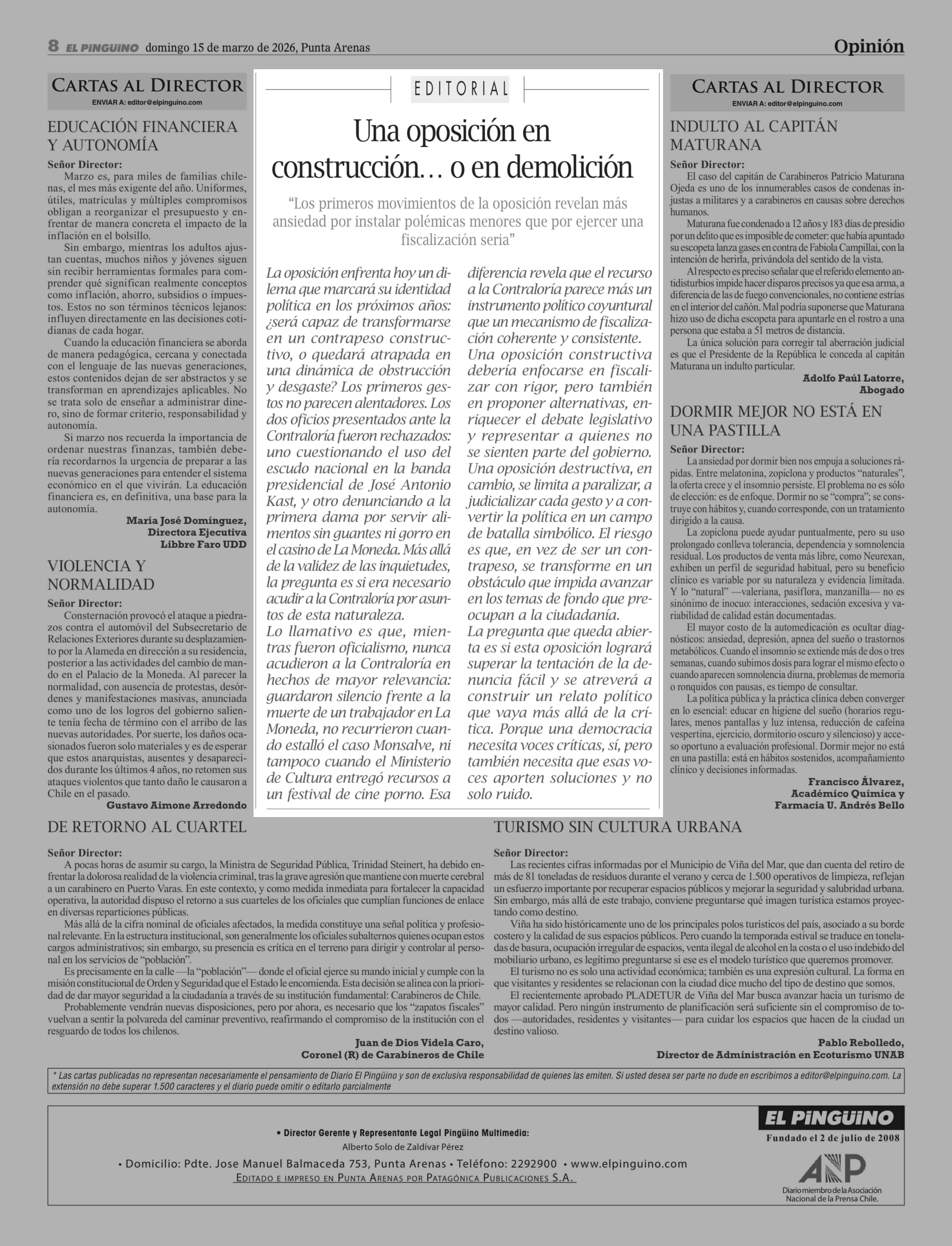 Editorial: Una oposición en construcción ... o en demolición 15-03-2026 El Pingüino |