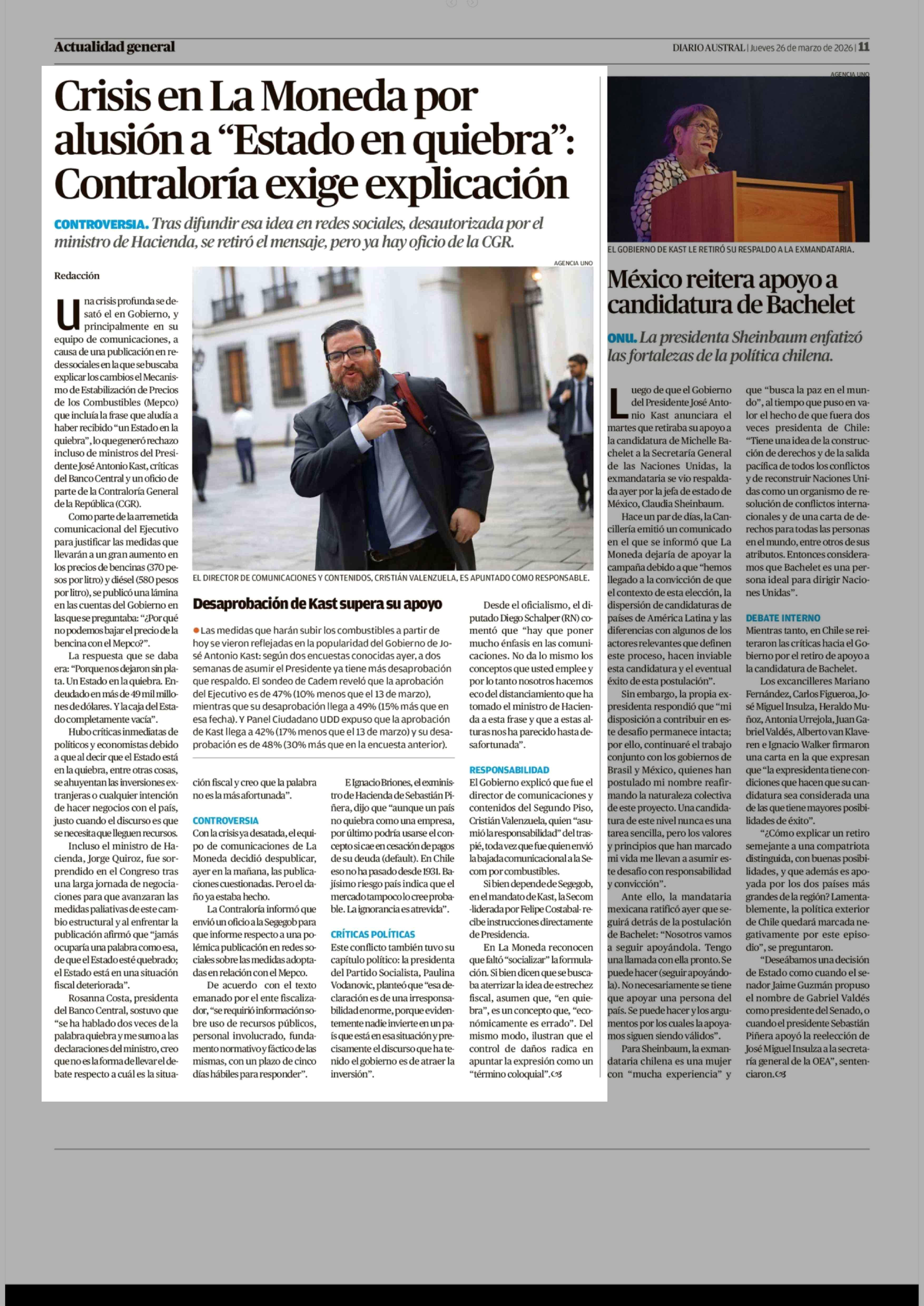 Crisis en La Moneda por alusión a "Estado en quiebra": Contraloría exige explicación 26-03-2026 Diario Austral Región de Los Ríos |