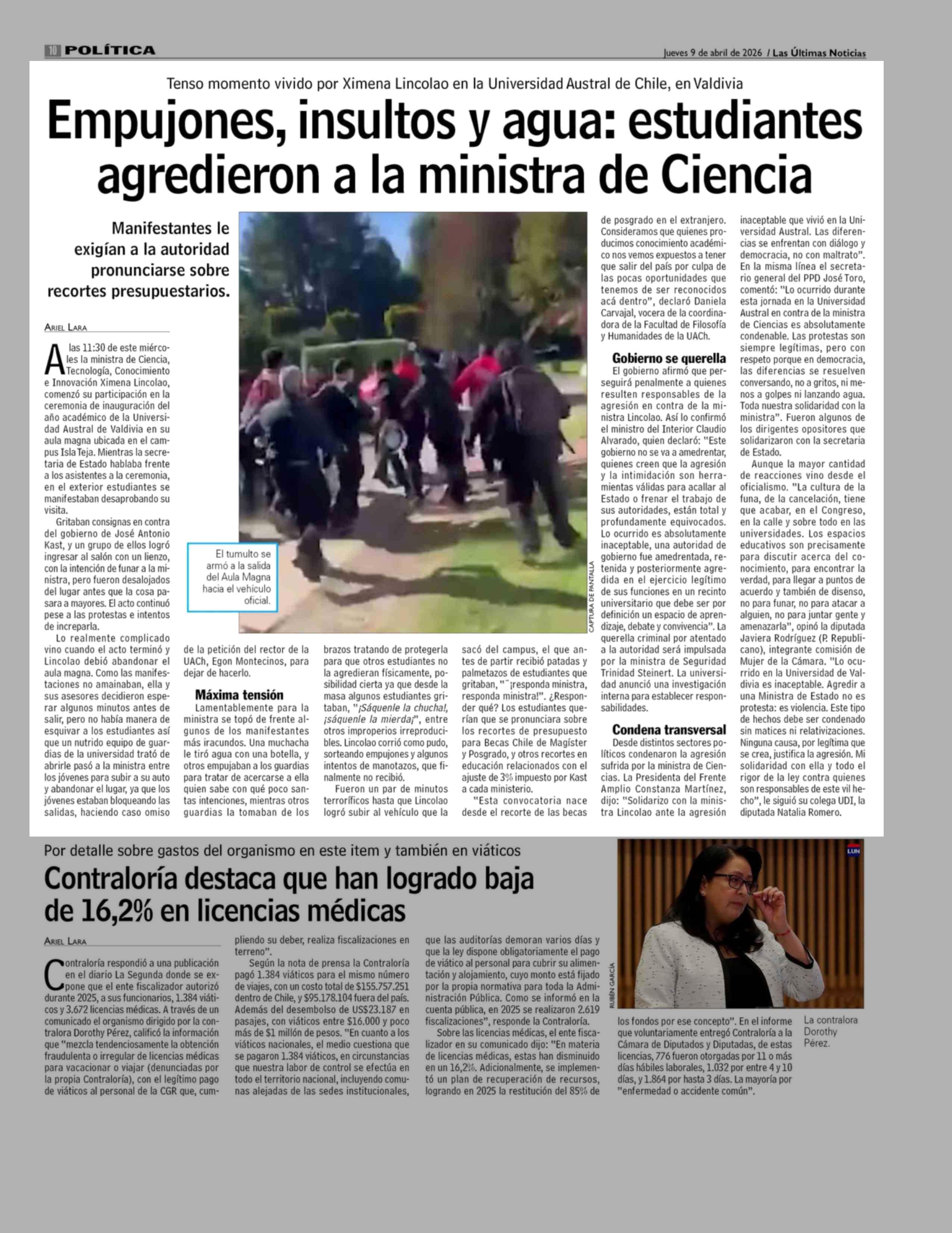 Empujones, insultos y agua: estudiantes agredieron a la ministra de Ciencia 09-04-2026 Las Últimas Noticias |