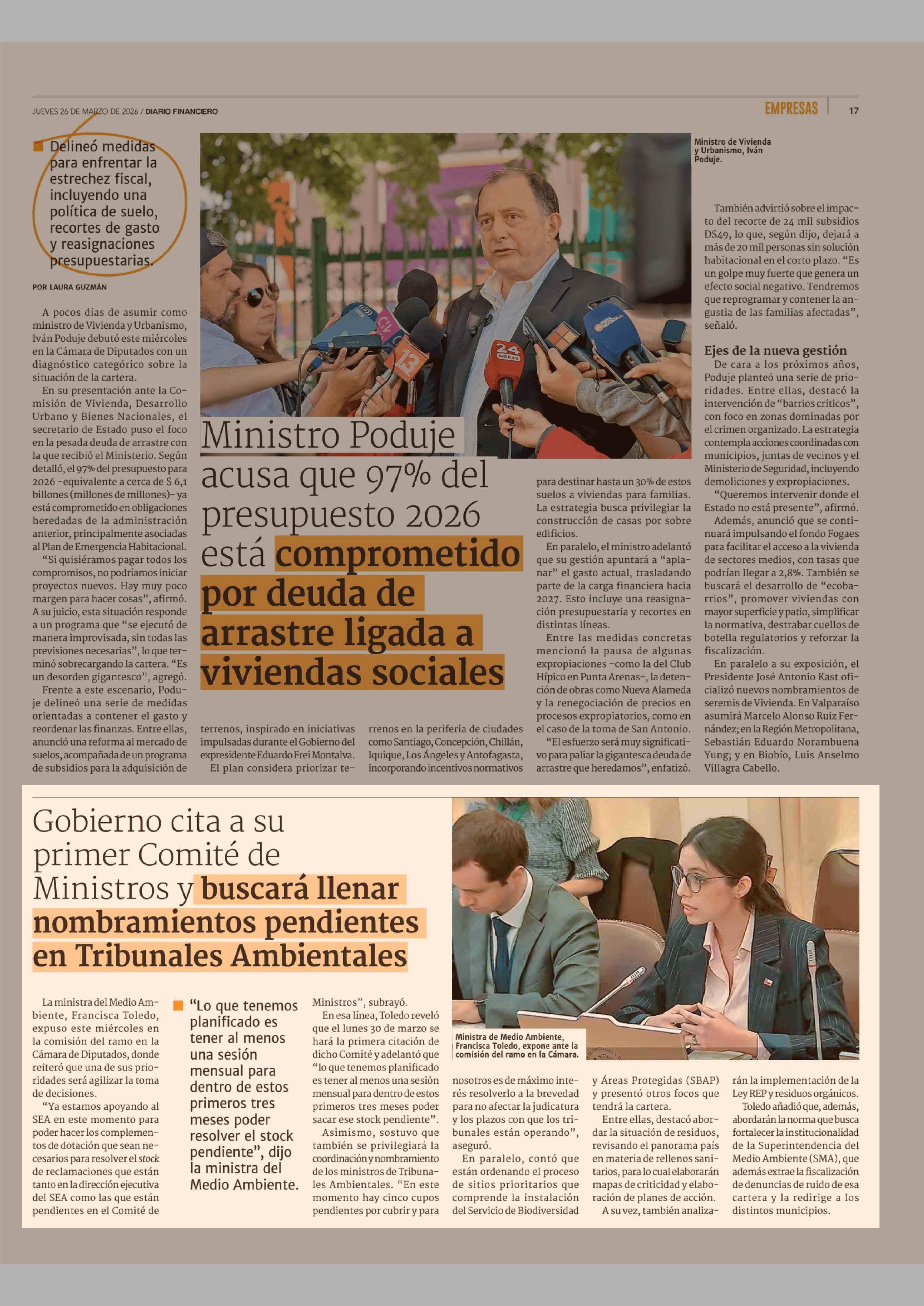 Gobierno cita a su primer Comité de Ministros y buscará llenar nombramientos pendientes en Tribunales Ambientales 26-03-2026 Diario Financiero |