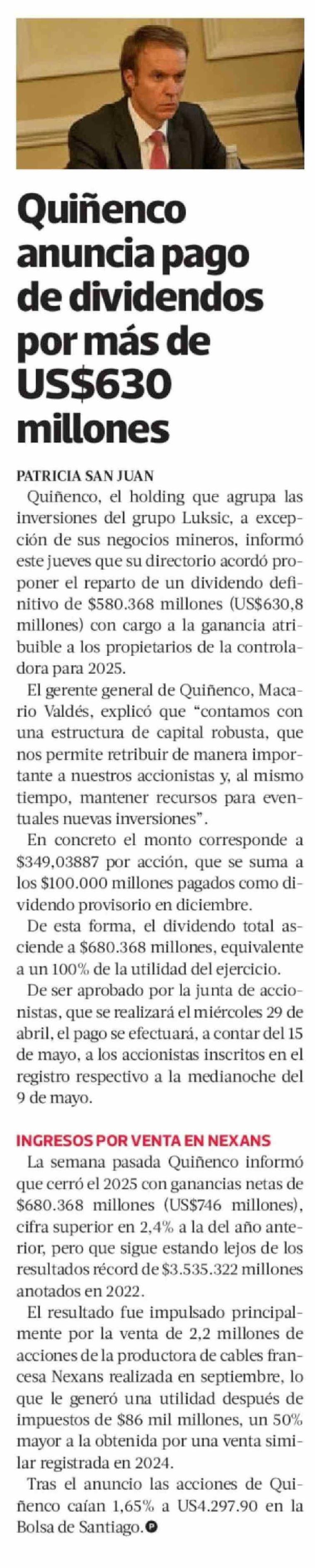 Título: Quiñenco anuncia pago de dividendos por más de US$630 millones