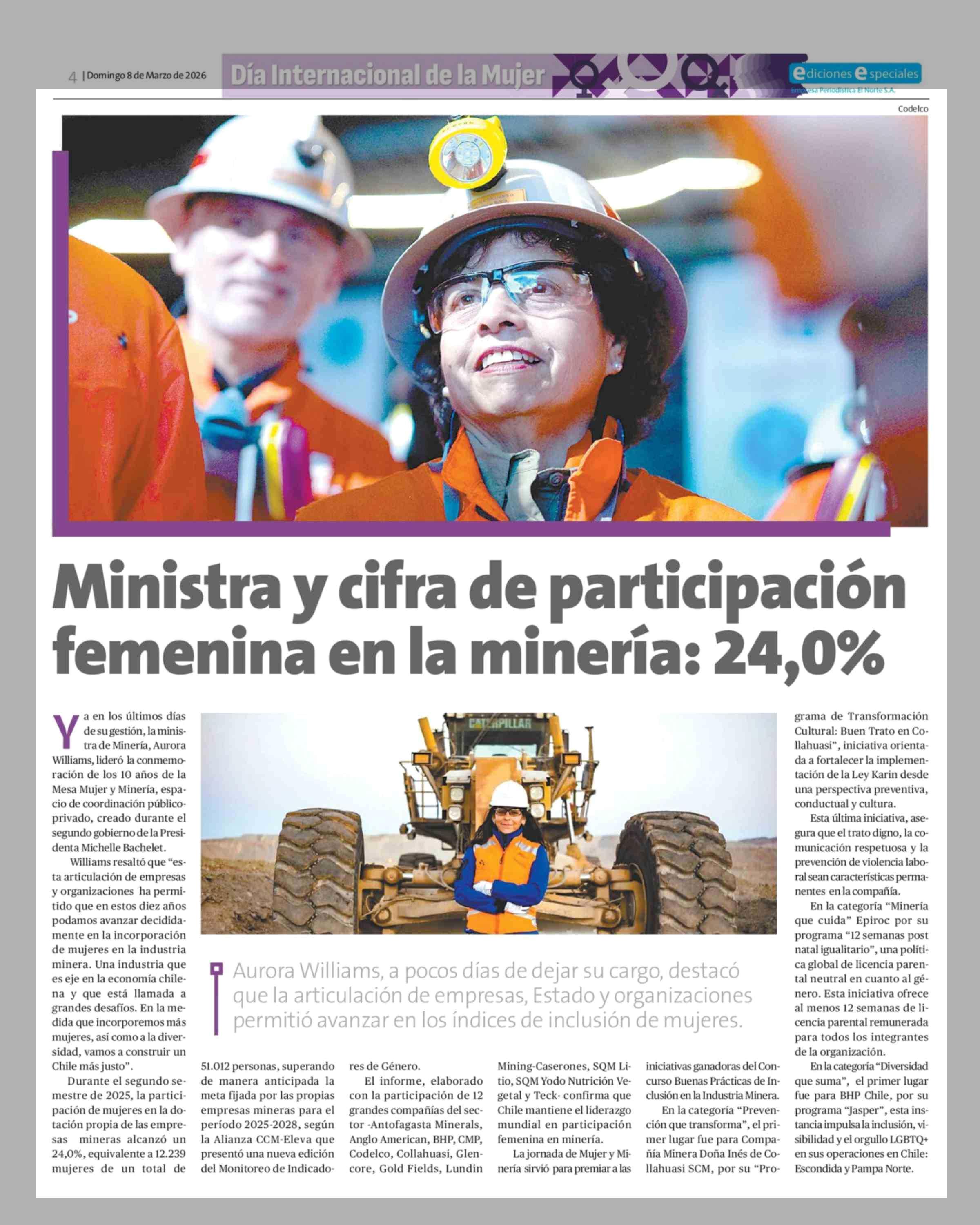 Ministra y cifra de participación femenina en la minería: 24,0% 08-03-2026 El Diario de Atacama |