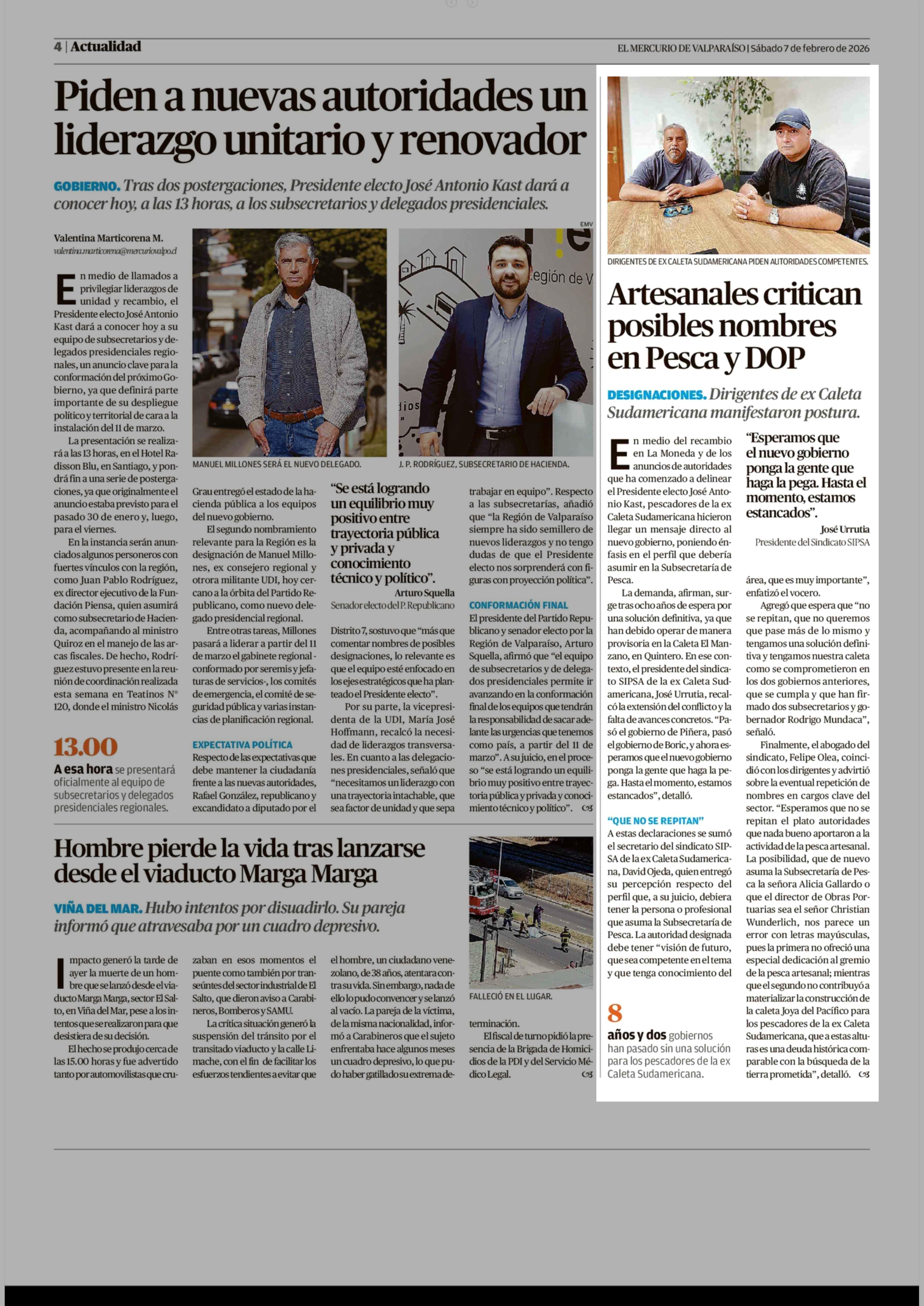 Artesanales critican posibles nombres en Pesca y DOP 07-02-2026 El Mercurio de Valparaíso |