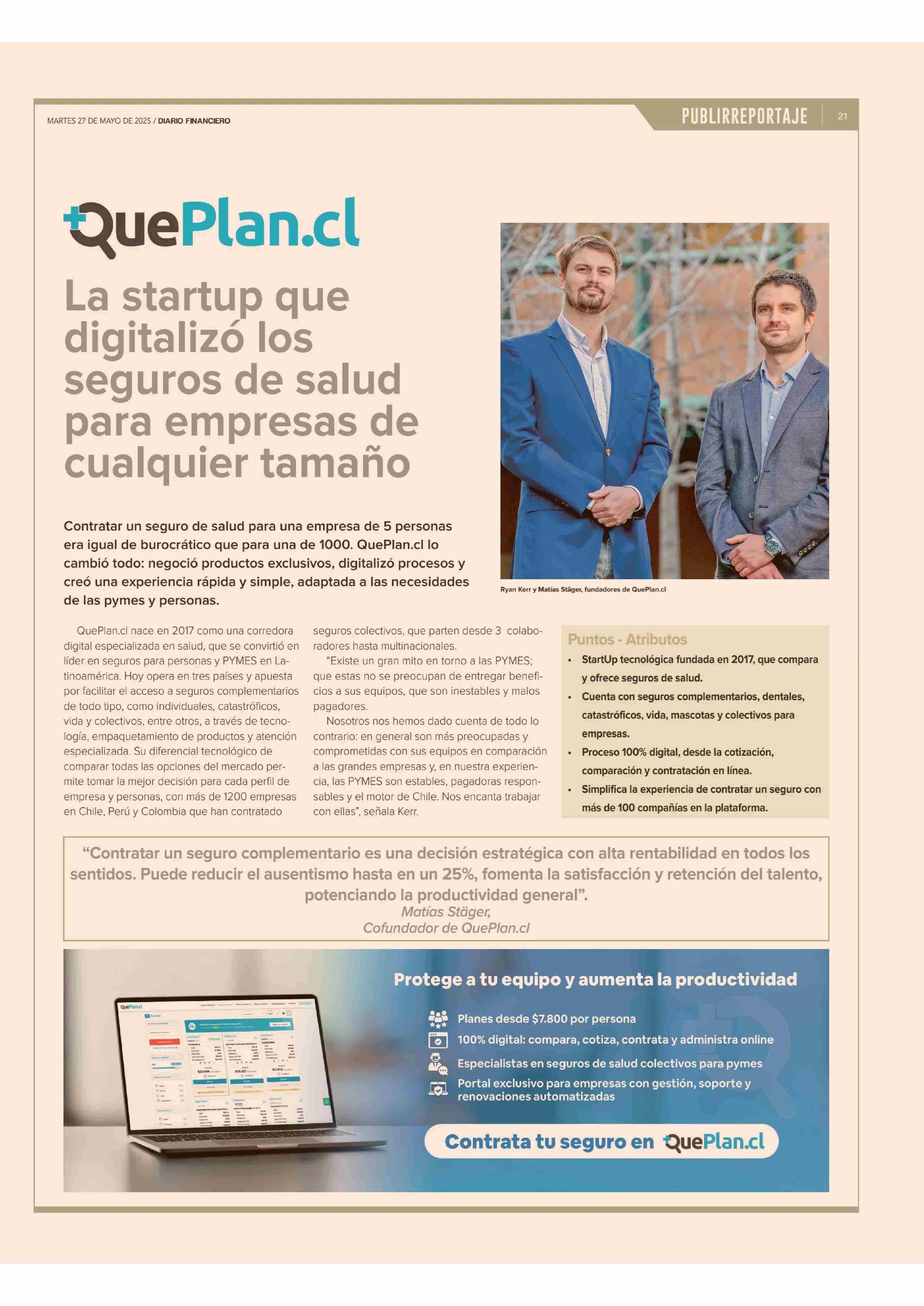 QuePlan.cl La startup que digitalizó los seguros de salud para empresas de cualquier tamaño 27-05-2025 Diario Financiero |