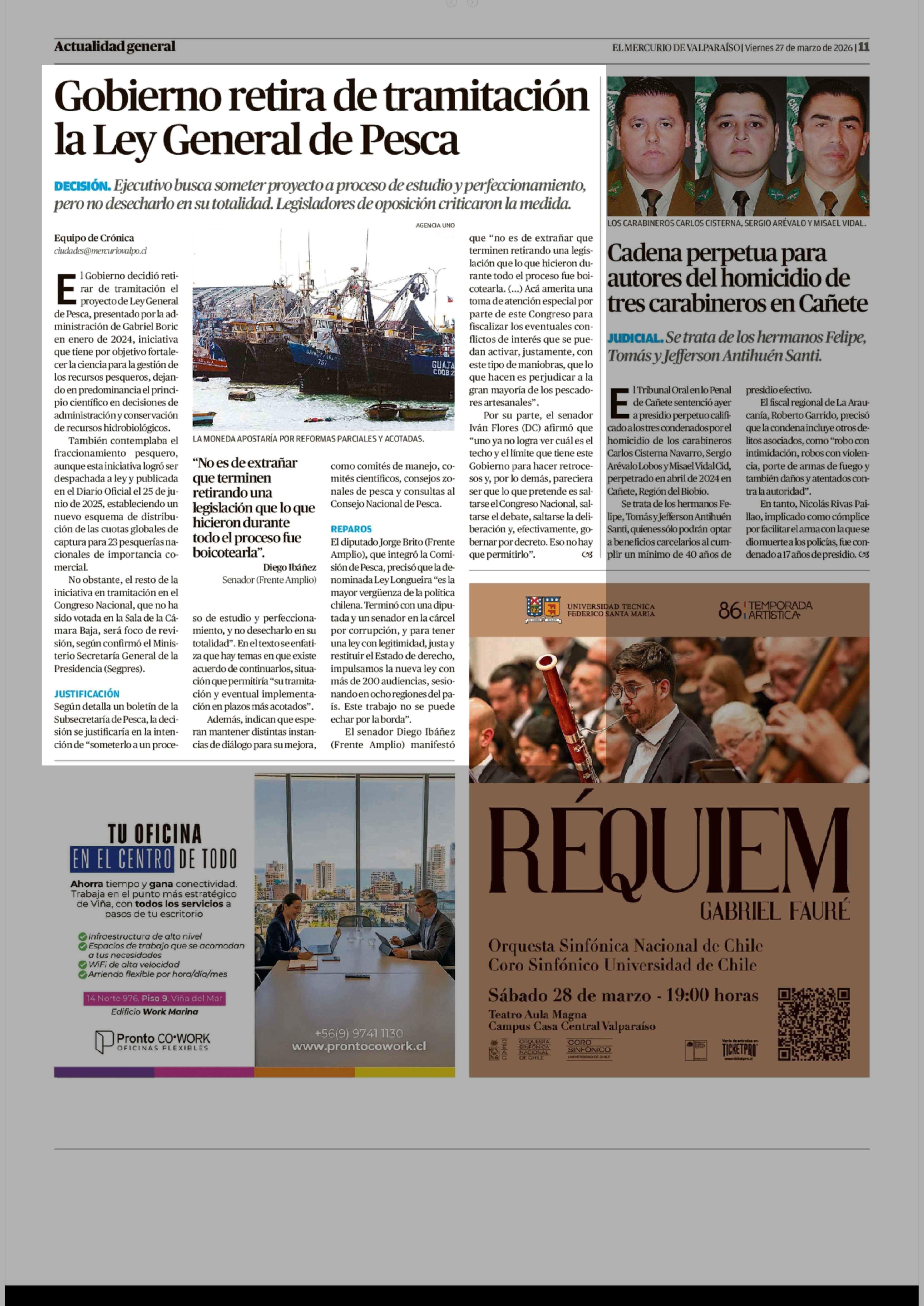Gobierno retira de tramitación la Ley General de Pesca 27-03-2026 El Mercurio de Valparaíso |