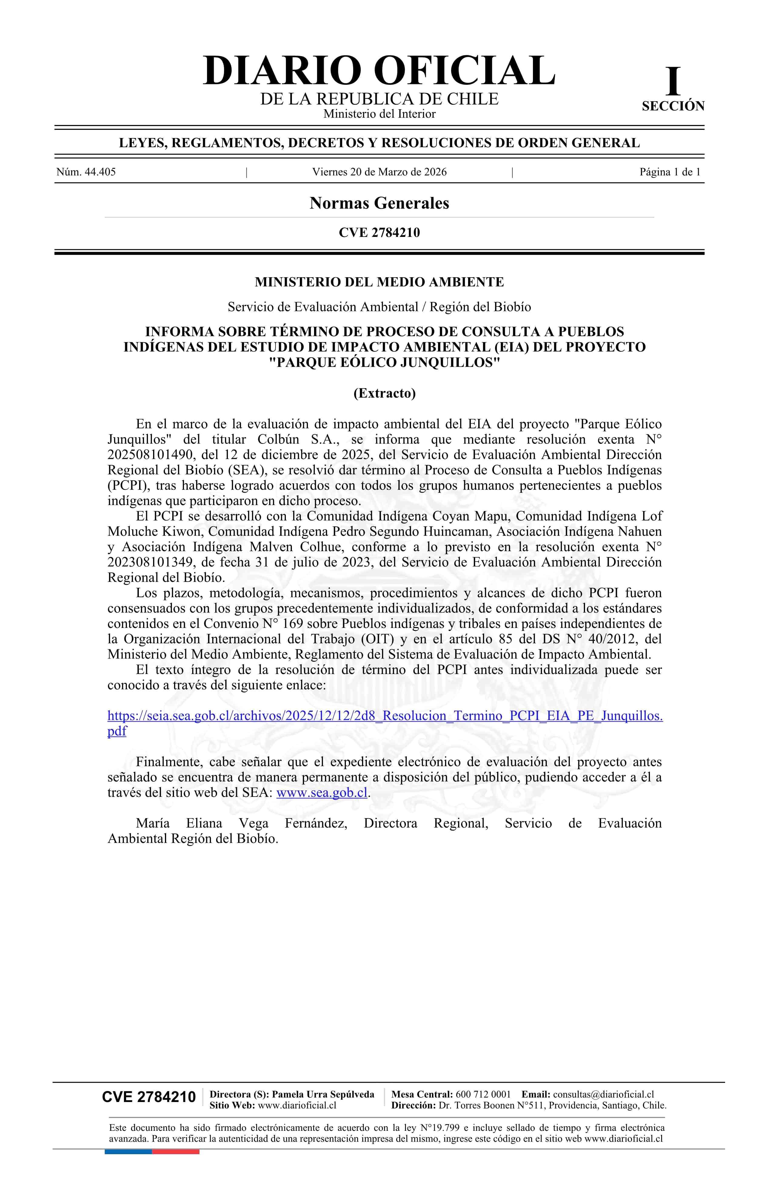 Título: Extracto de resolución exenta número 202508101490, de 2025.- Informa sobre término de proceso de consulta a pueblos indígenas del Estudio de Impacto Ambiental del proyecto Parque Eólico Junquillos