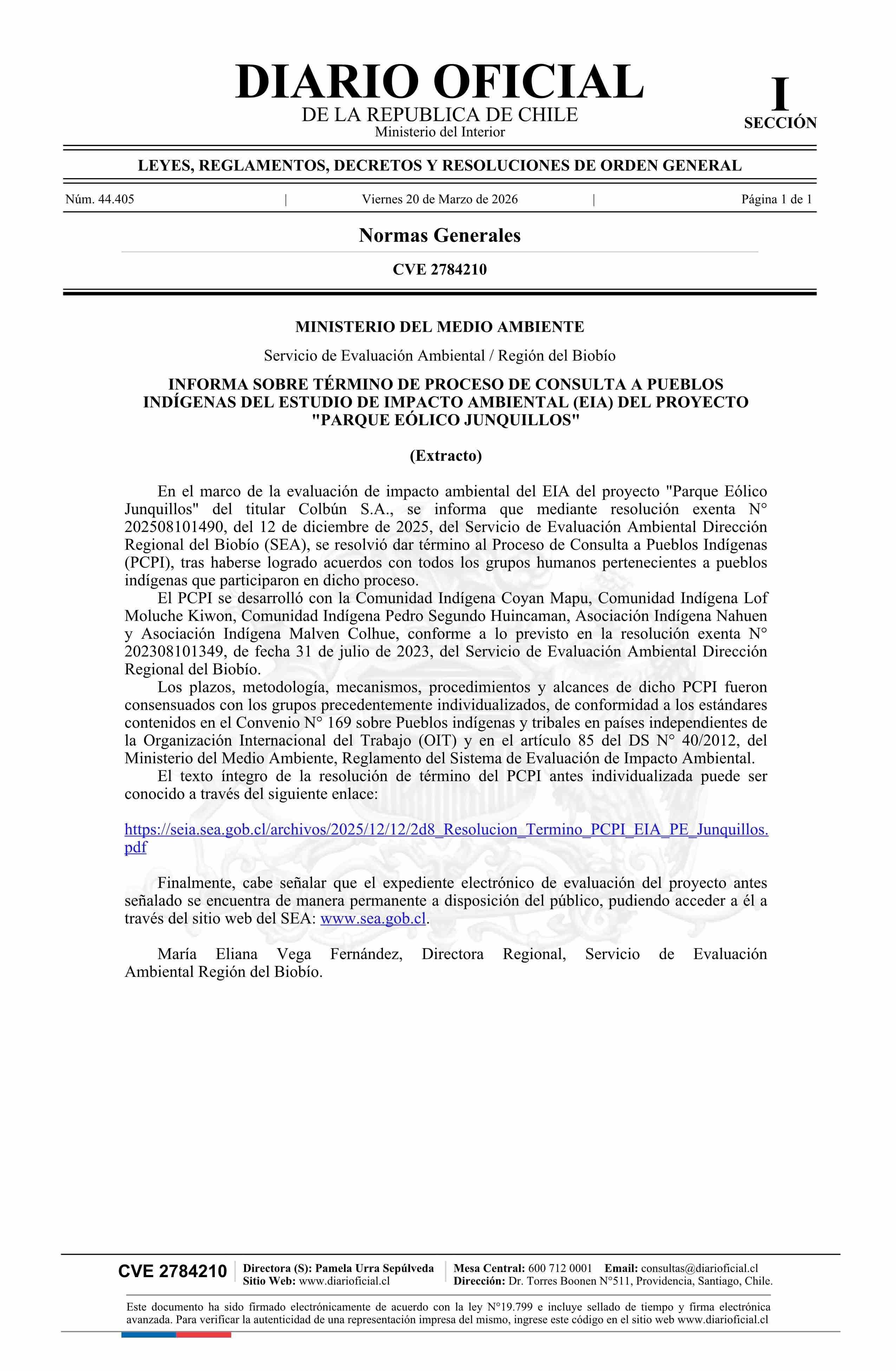 | Título: | Extracto de resolución exenta número 202508101490, de 2025.- Informa sobre término de proceso de consulta a pueblos indígenas del Estudio de Impacto Ambiental del proyecto Parque Eólico Junquillos |
