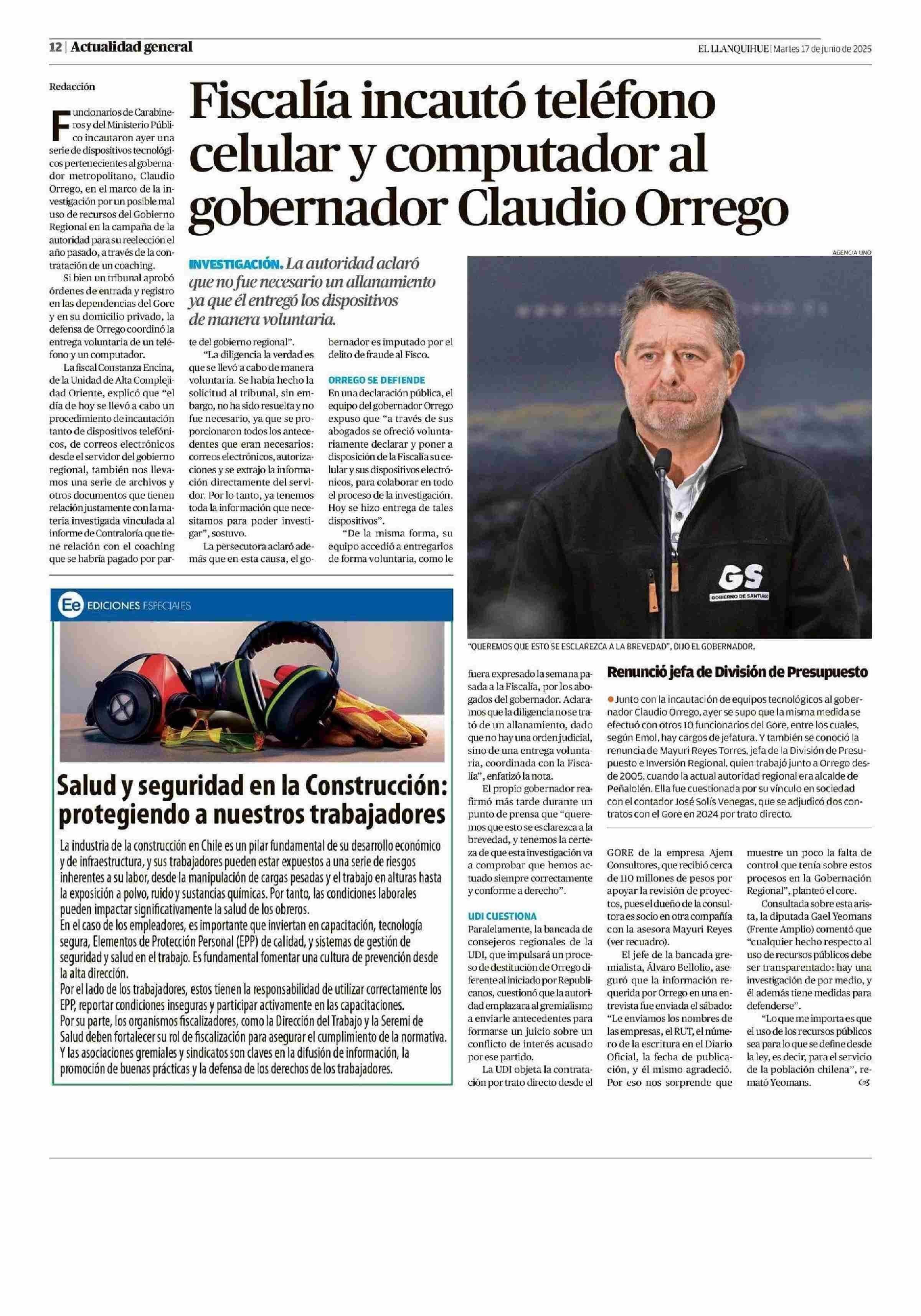Fiscalía incautó teléfono celular y computador al gobernador Claudio Orrego 17-06-2025 El Llanquihue |