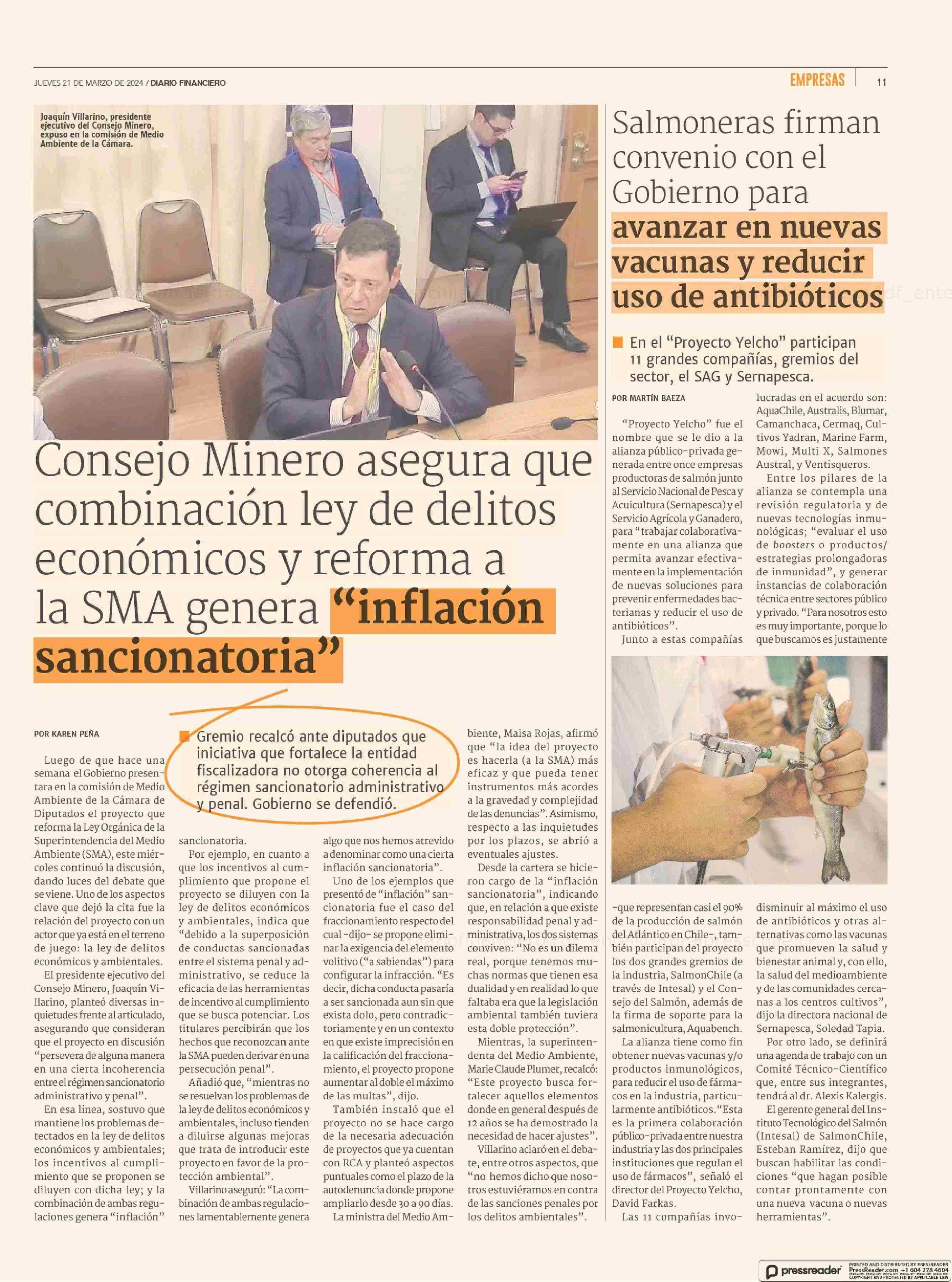 Salmoneras firman convenio con el Gobierno para avanzar en nuevas vacunas y reducir uso de antibióticos 21-03-2024 Diario Financiero |