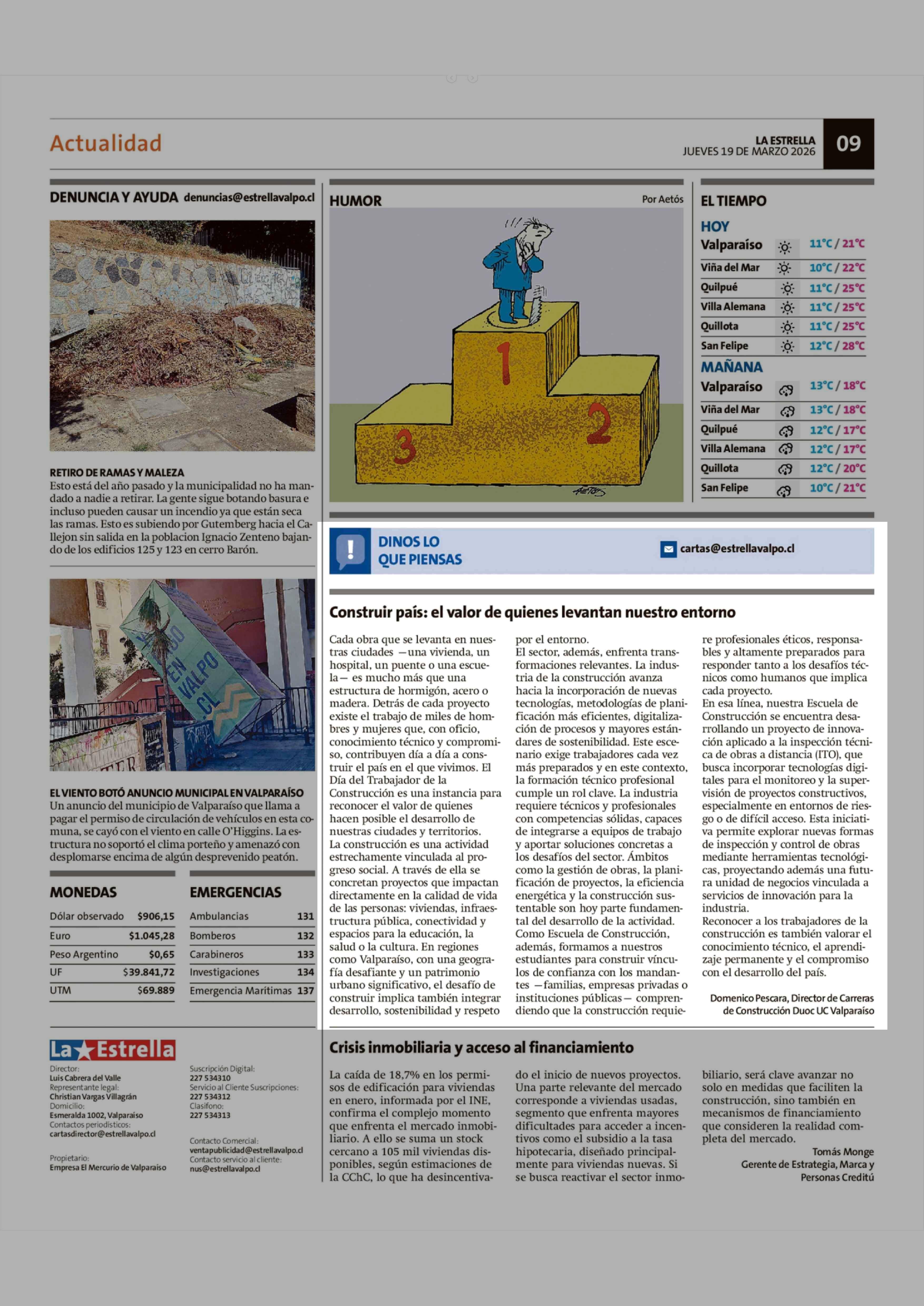 Cartas: Construir país: el valor de quienes levantan nuestro entorno 19-03-2026 La Estrella de Valparaíso |