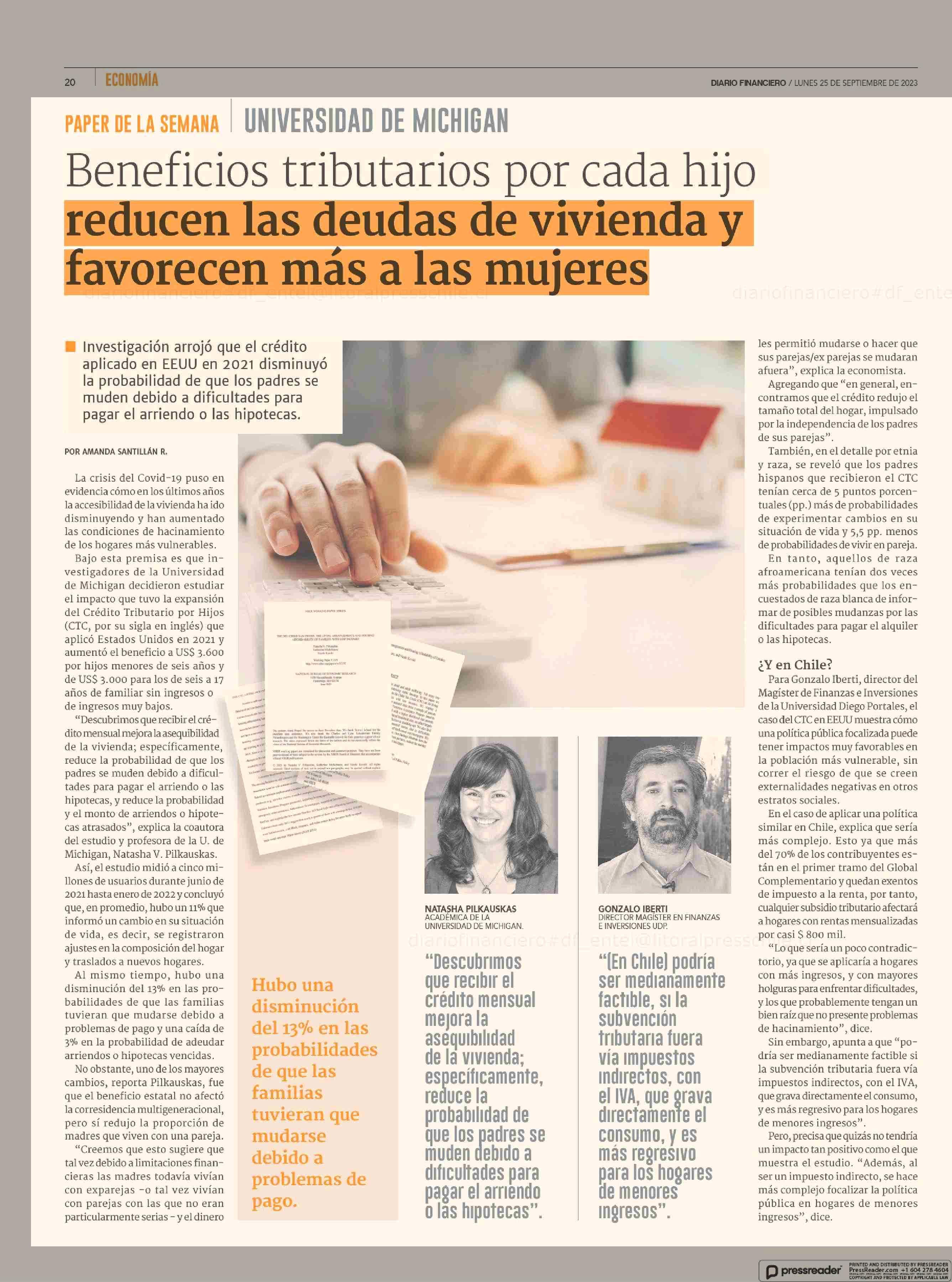 Beneficios tributarios por cada hijo reducen las deudas de vivienda y favorecen más a las mujeres 25-09-2023 Diario Financiero |