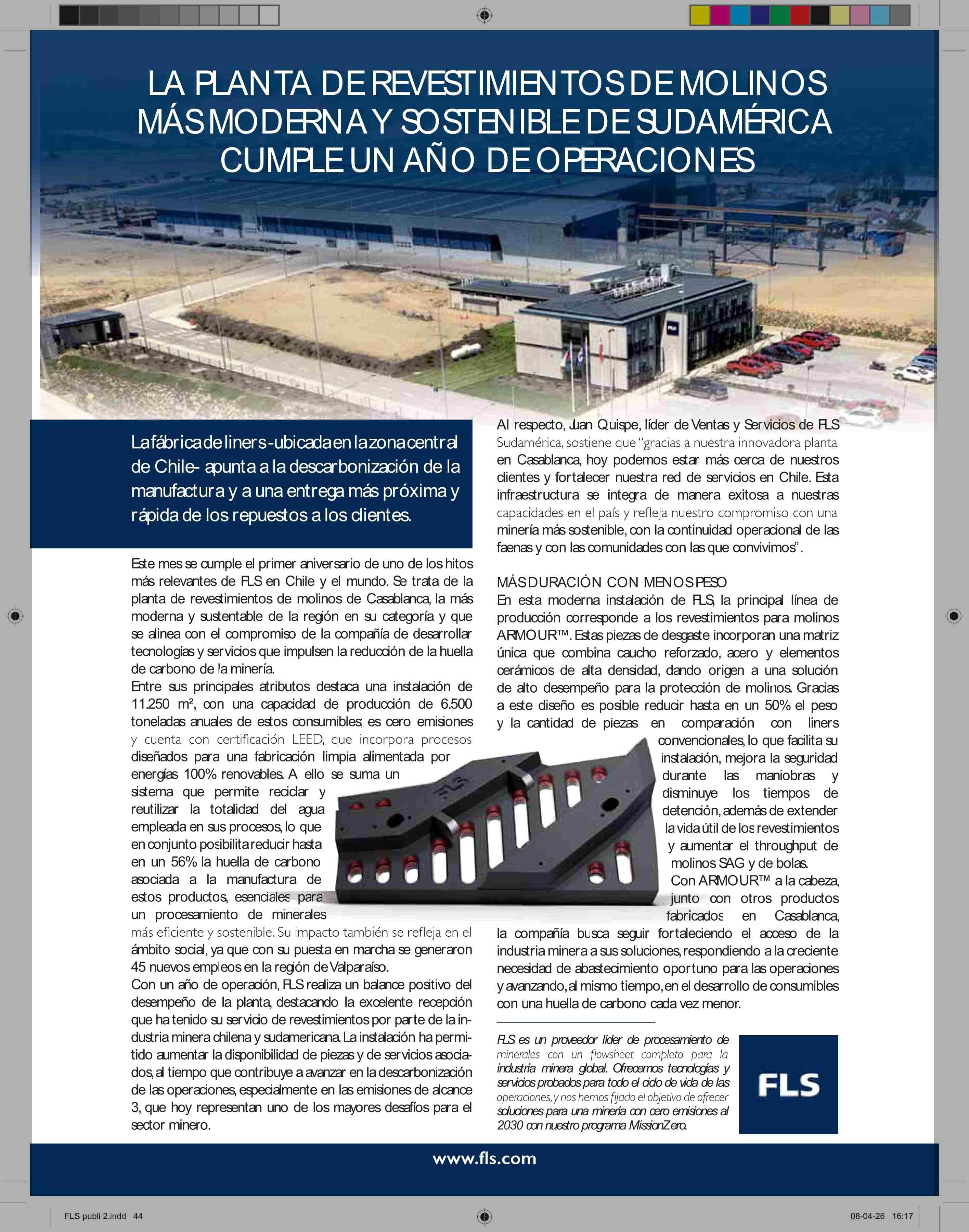 LA PLANTA DE REVESTIMIENTOS DE MOLINOS MAS MODERNA Y SOSTENIBLE DE SUDAMERICA CUMPLE UN AÑO 15-04-2026 Revista Nueva Minería & Energía |