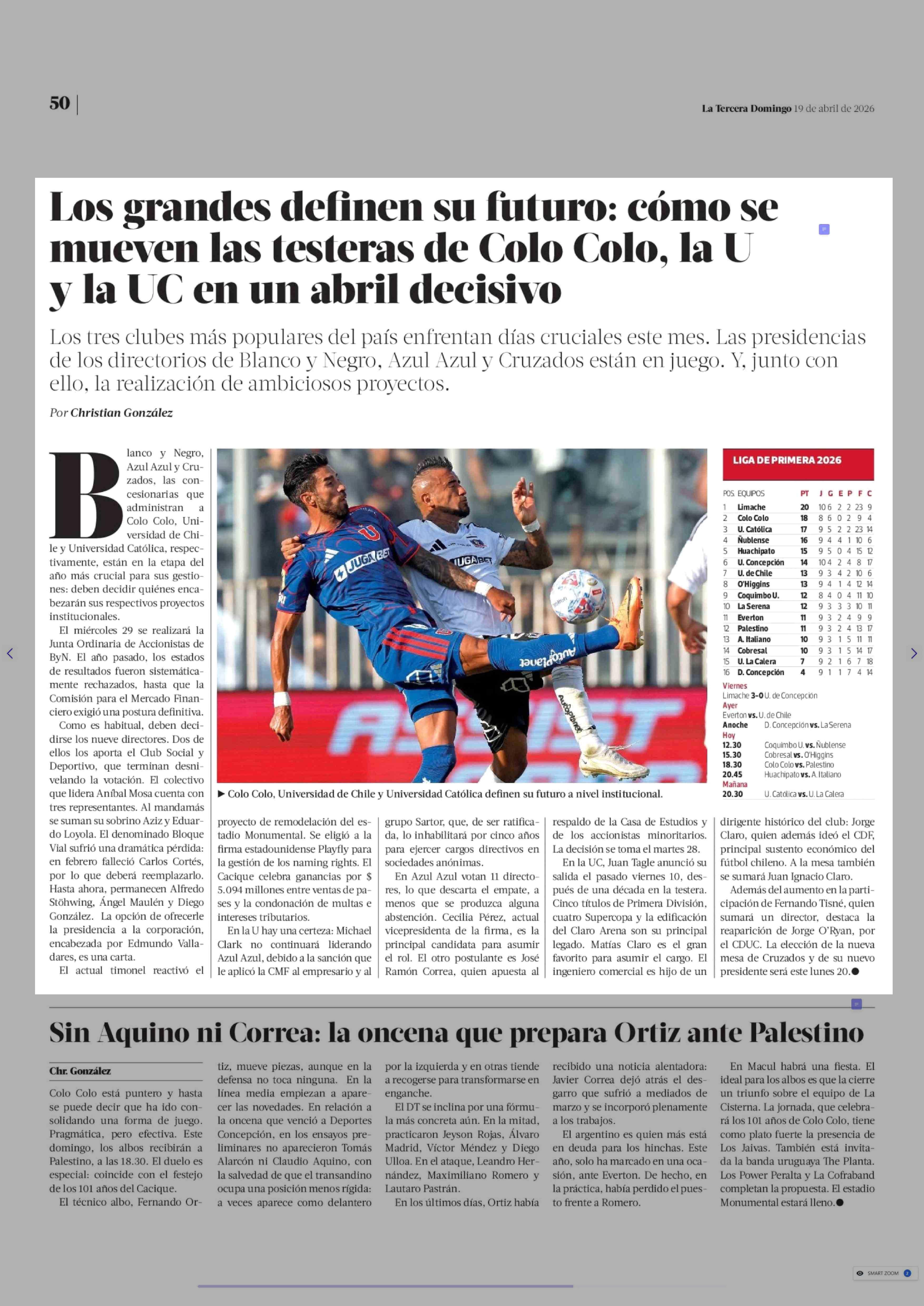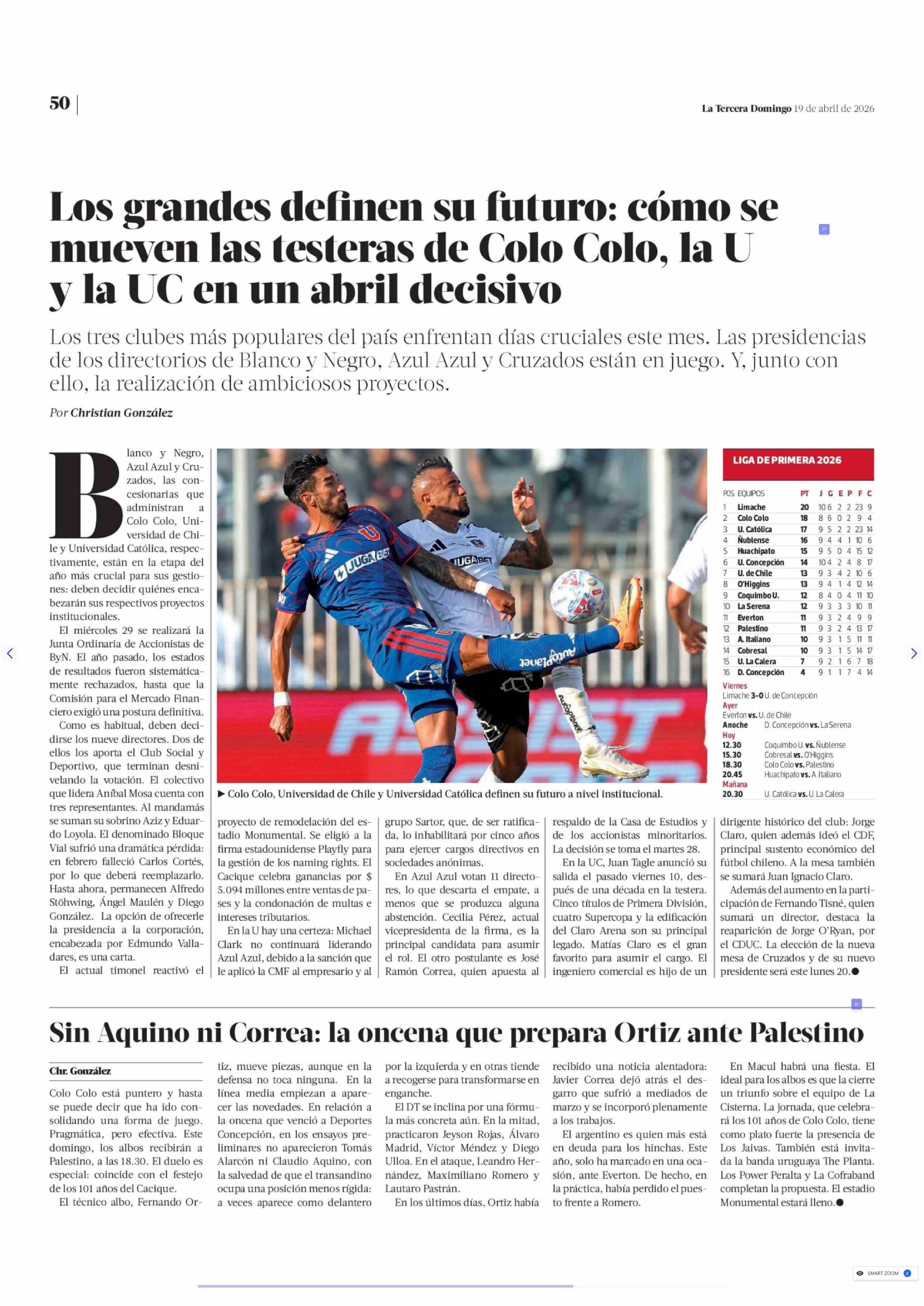 Los grandes definen su futuro: cómo se mueven las testeras de Colo Colo, la U y la UC en un abril decisivo 19-04-2026 La Tercera |