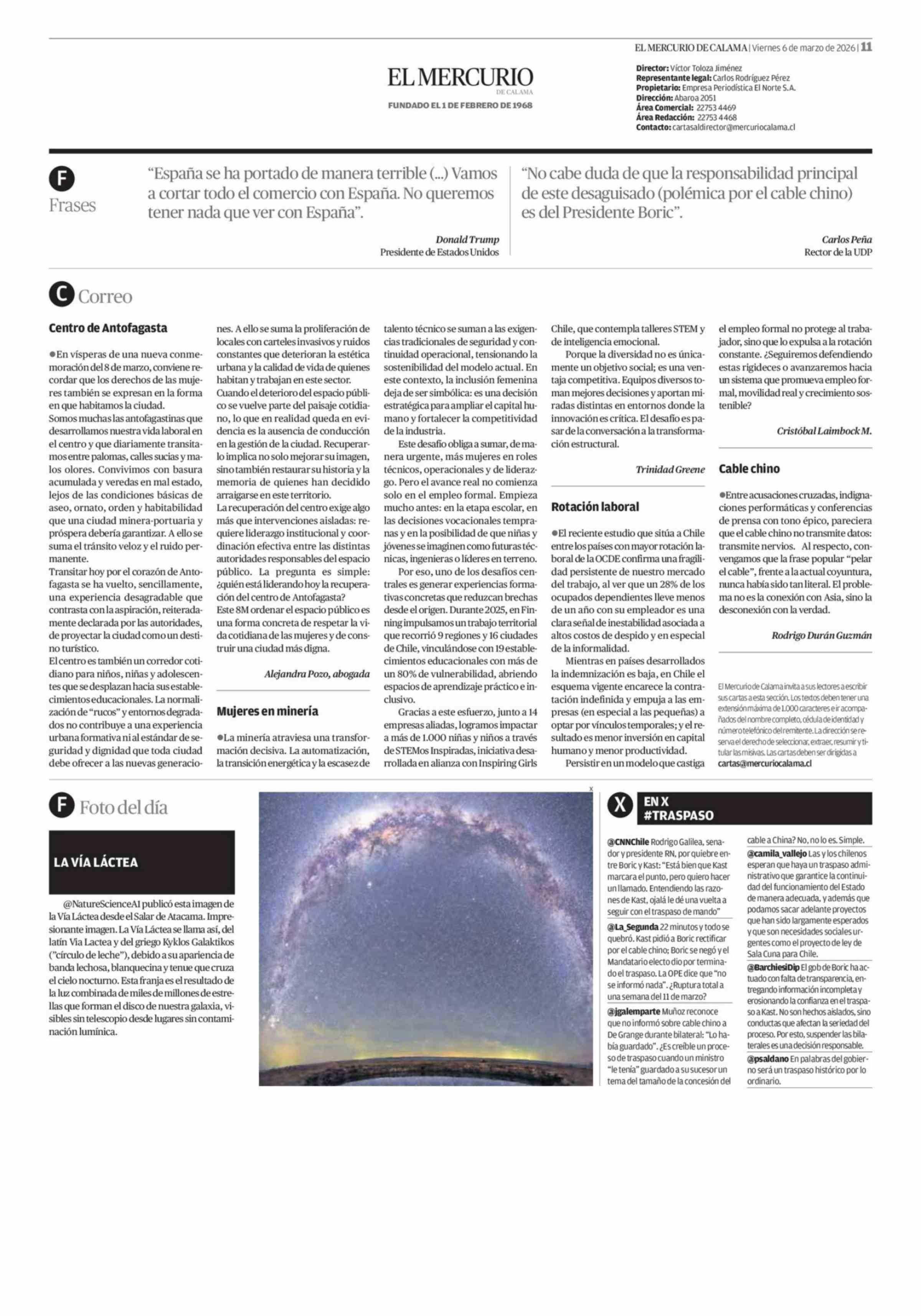 Cartas: Mujeres en minería 06-03-2026 El Mercurio de Calama |