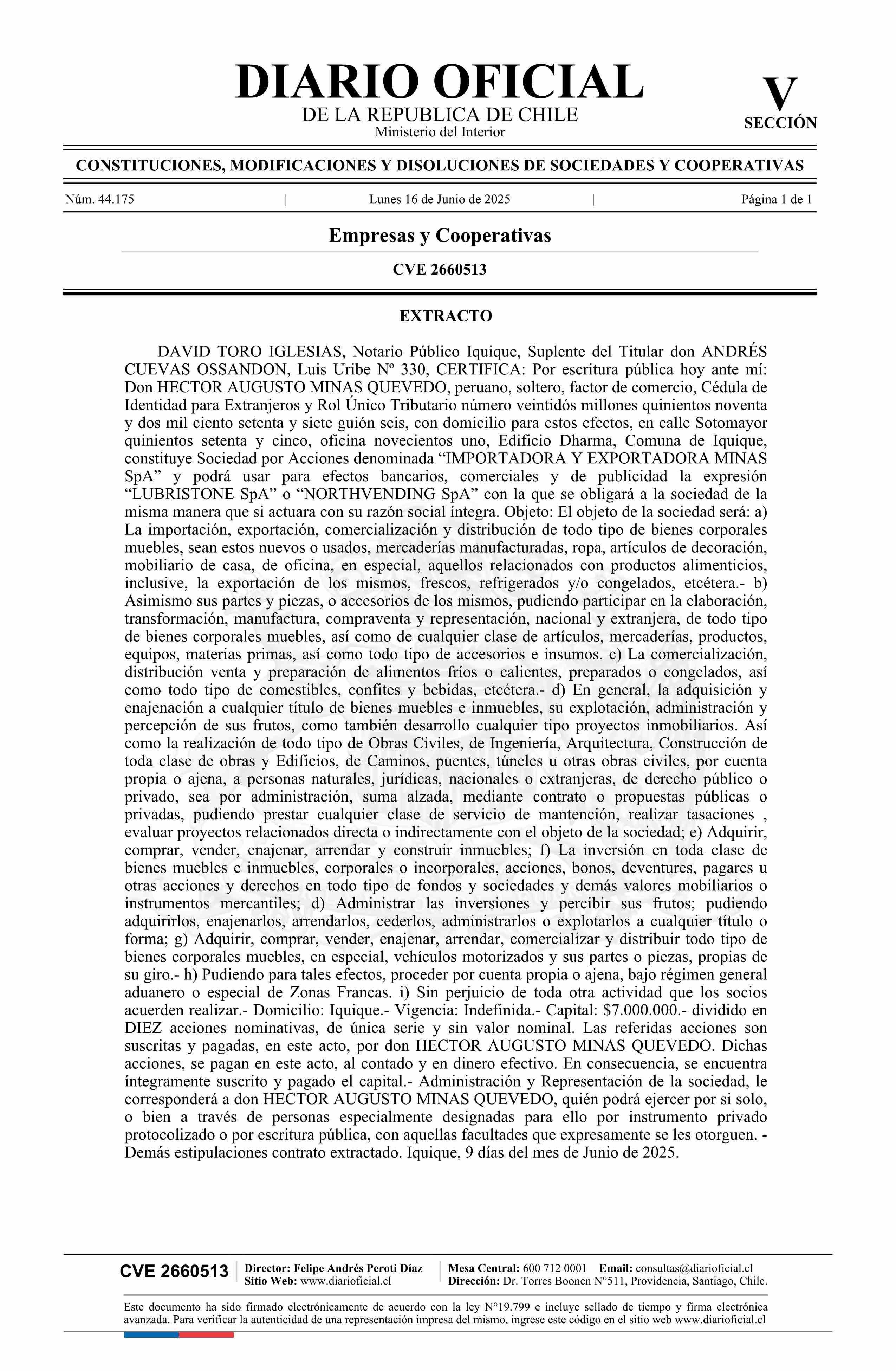 IMPORTADORA Y EXPORTADORA MINAS SpA 16-06-2025 Diario Oficial Edición Electrónica |
