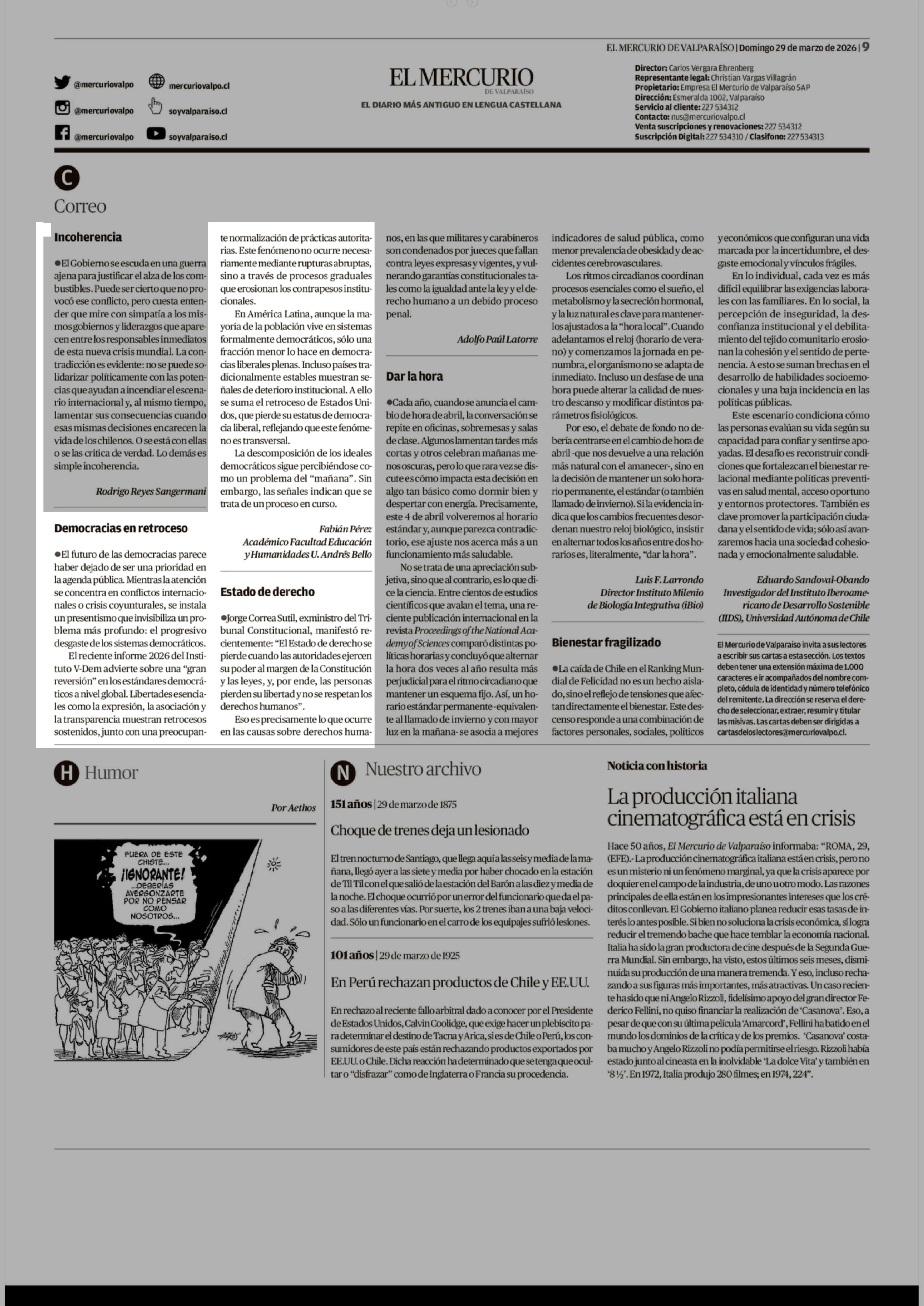 CARTAS: Democracias en retroceso 29-03-2026 El Mercurio de Valparaíso |