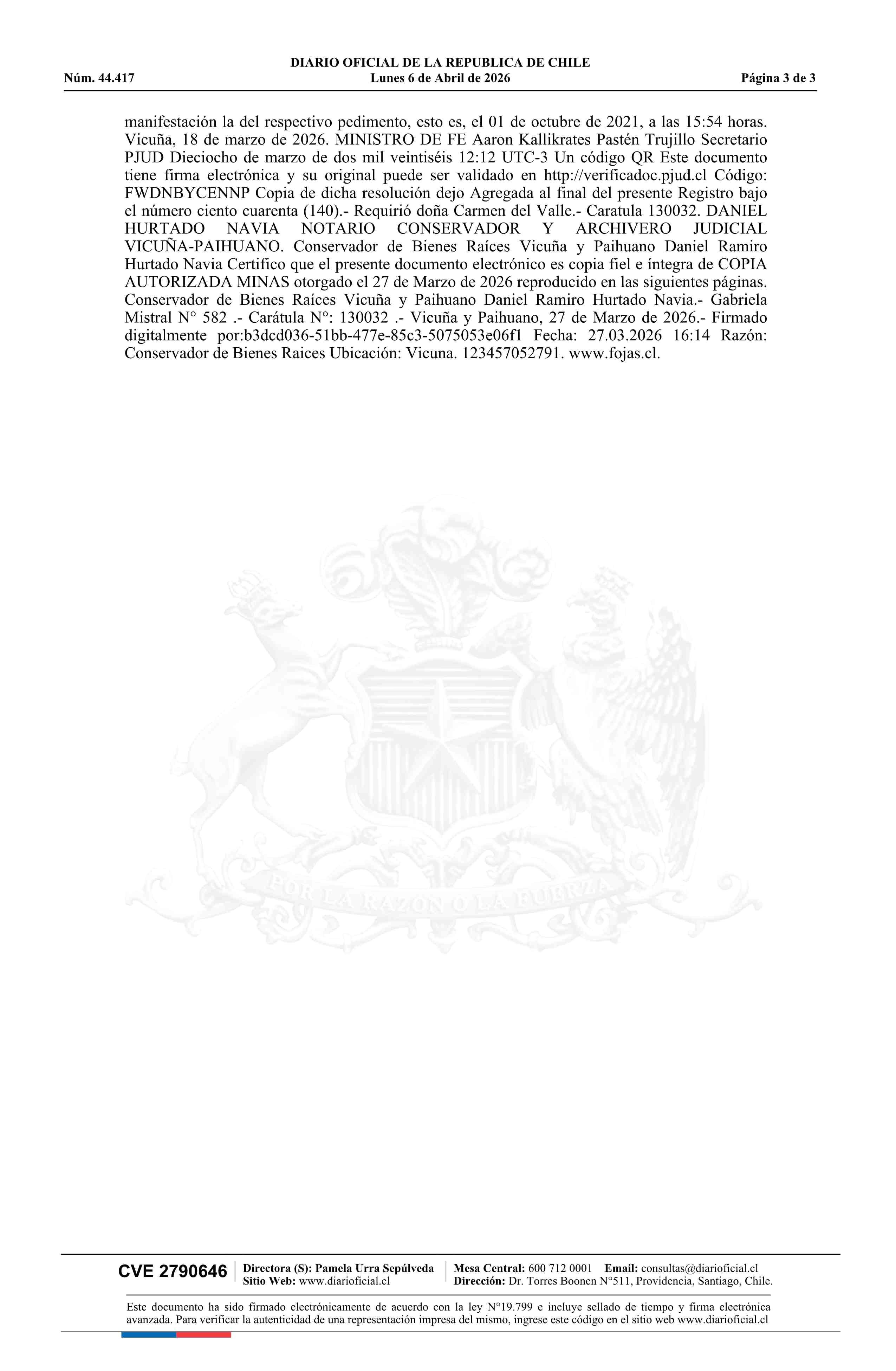 | Fuente: | DIARIO OFICIAL CHILE - BOLETÍN OFICIAL DE MINERÍA (DIARIO OFICIAL CHILE – BOM – MANIFESTACIONES MIN) | Página(s): | 32-34 |