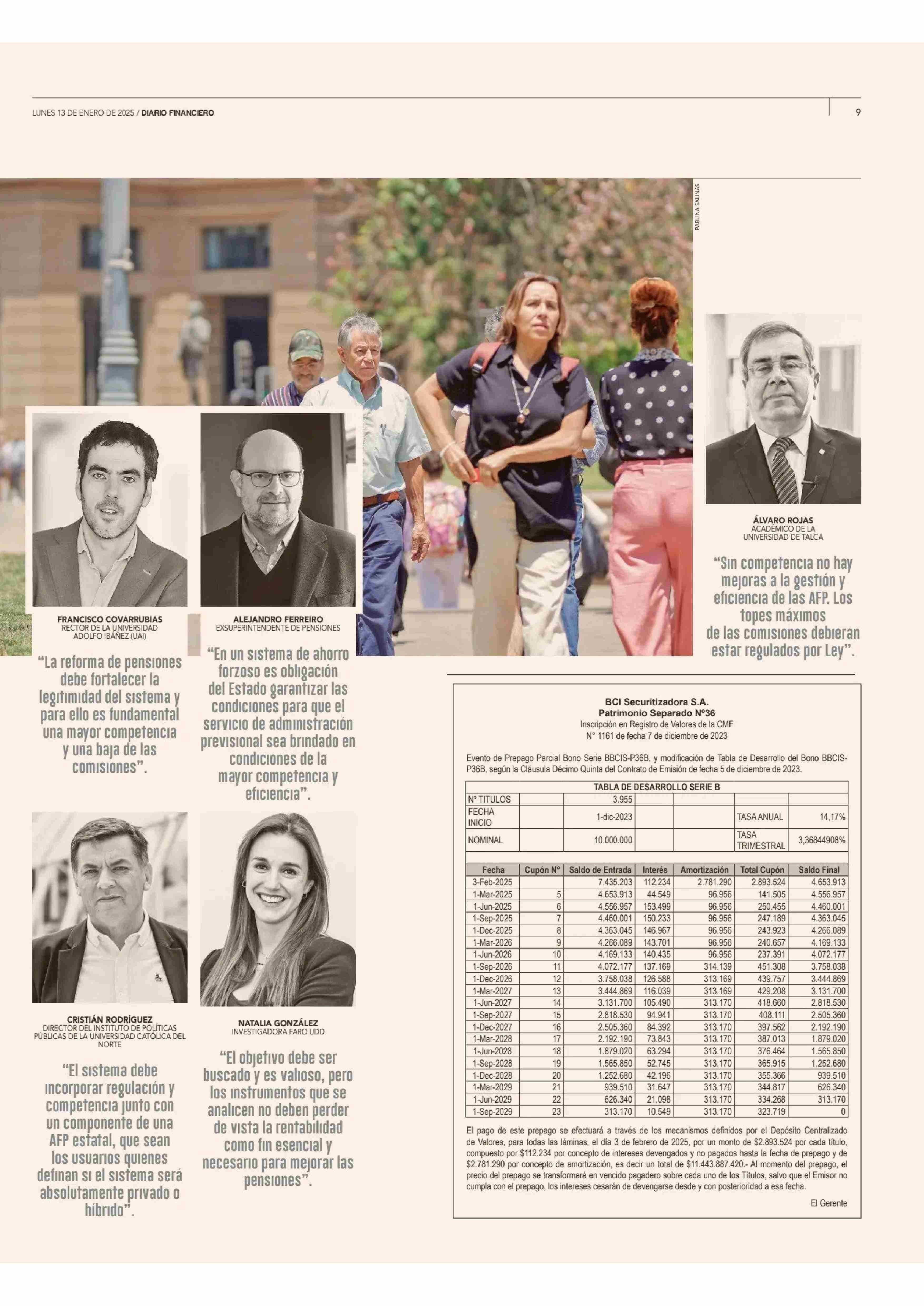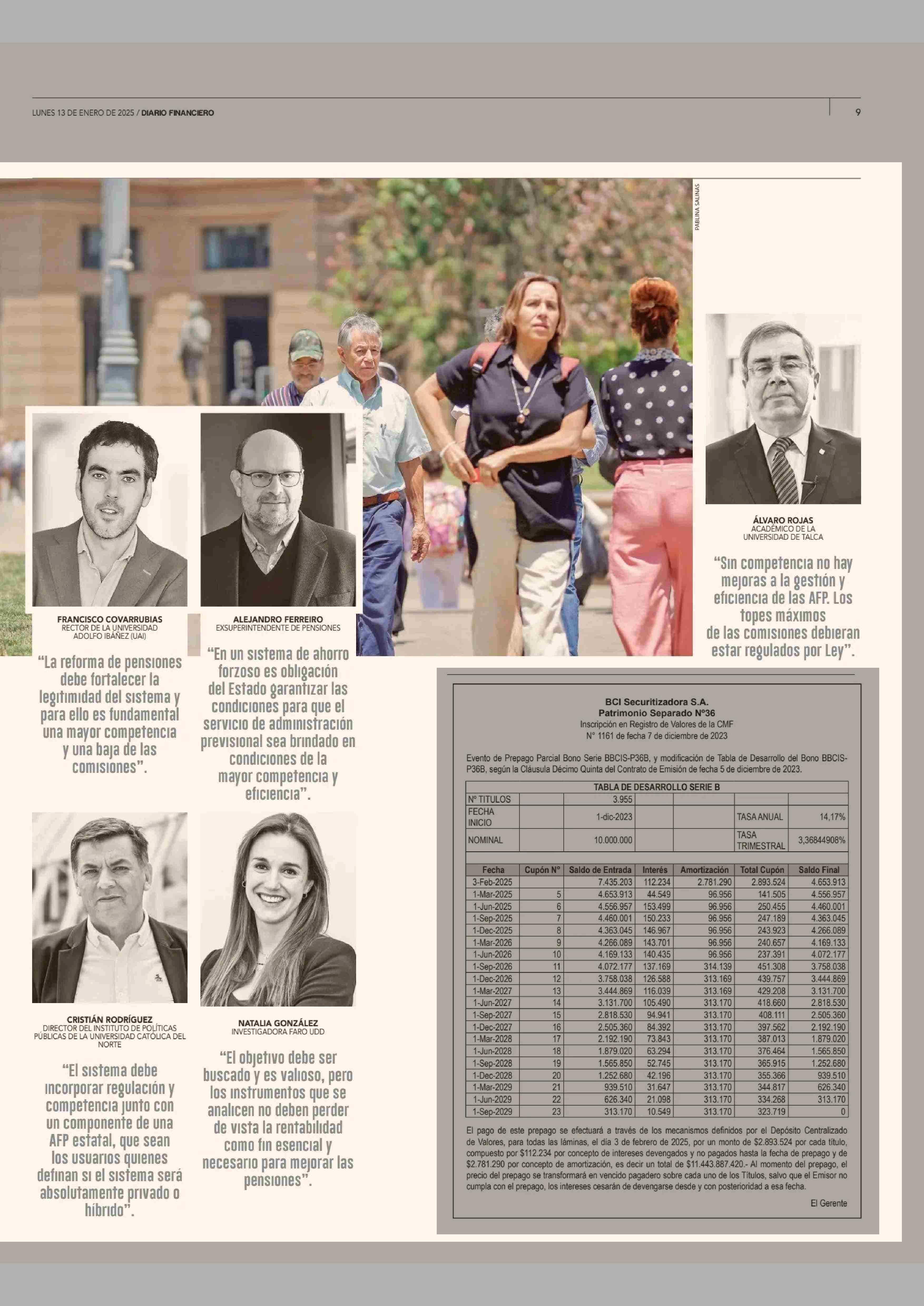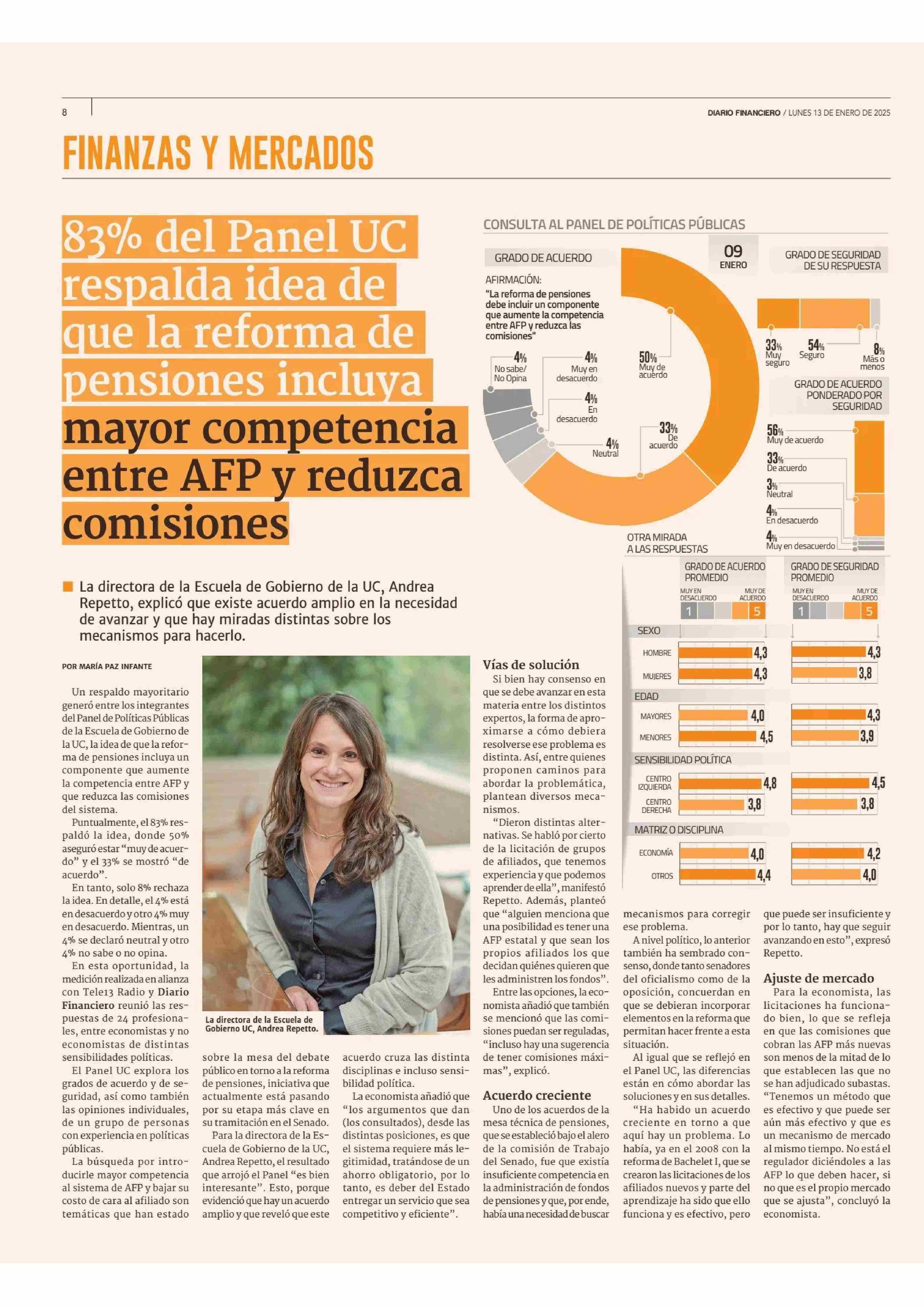 83% del Panel UC respalda idea de que la reforma de pensiones incluya mayor competencia entre AFP y reduzca comisiones 13-01-2025 Diario Financiero |