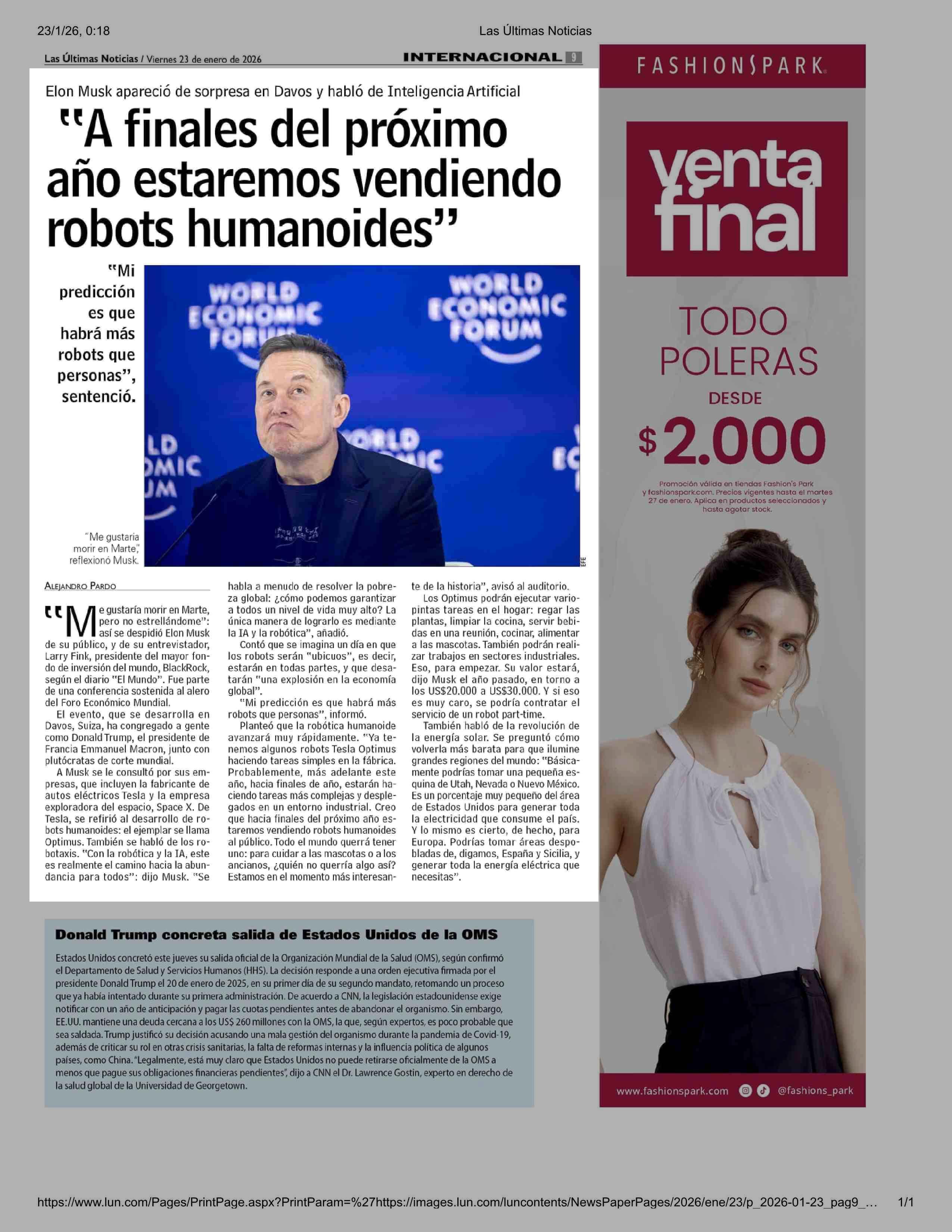 "A finales del próximo año estaremos vendiendo robots humanoides" 23-01-2026 Las Últimas Noticias |