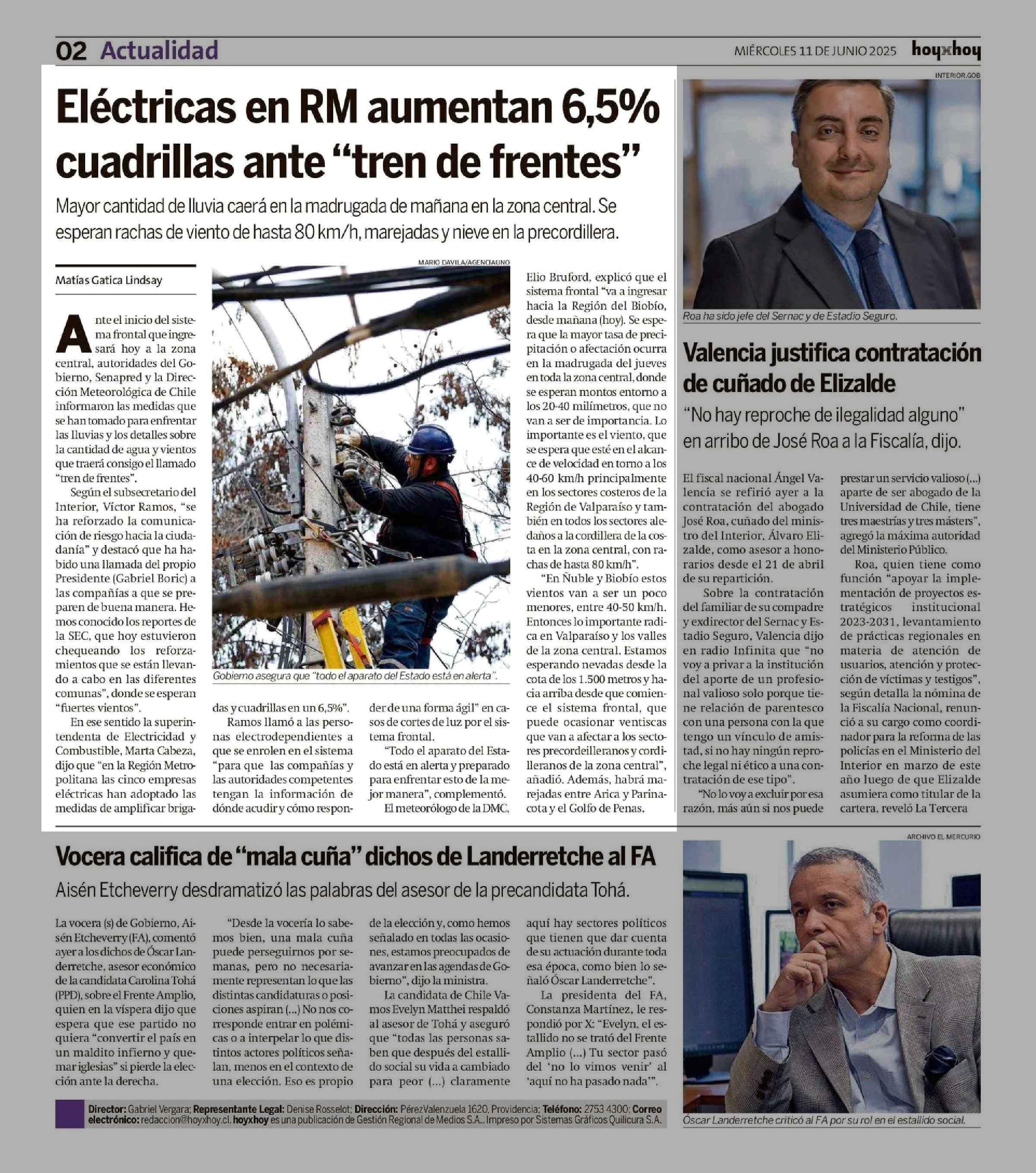 Eléctricas en RM aumentan 6,5% cuadrillas ante “tren de frentes” 11-06-2025 Hoy x Hoy |
