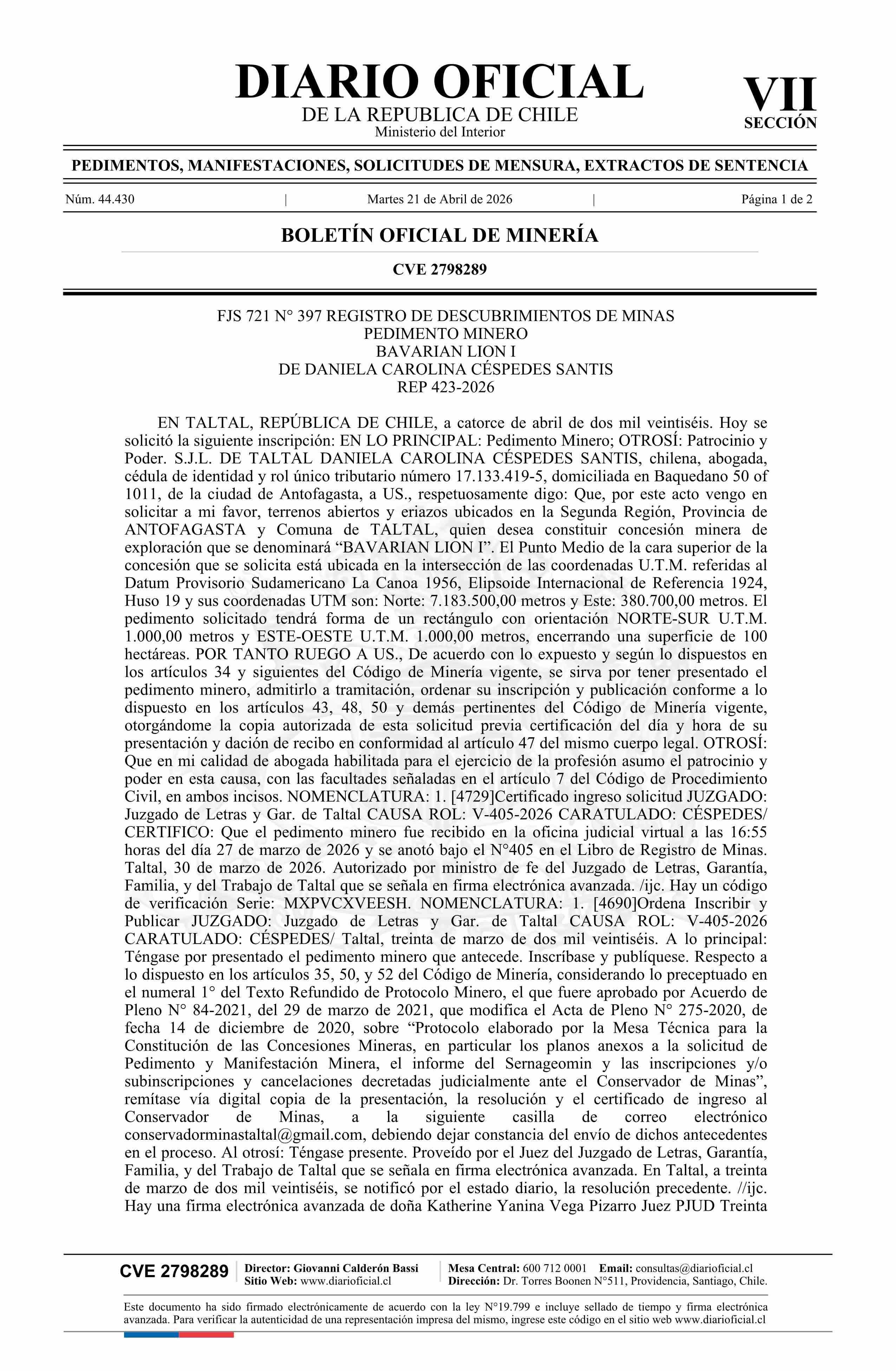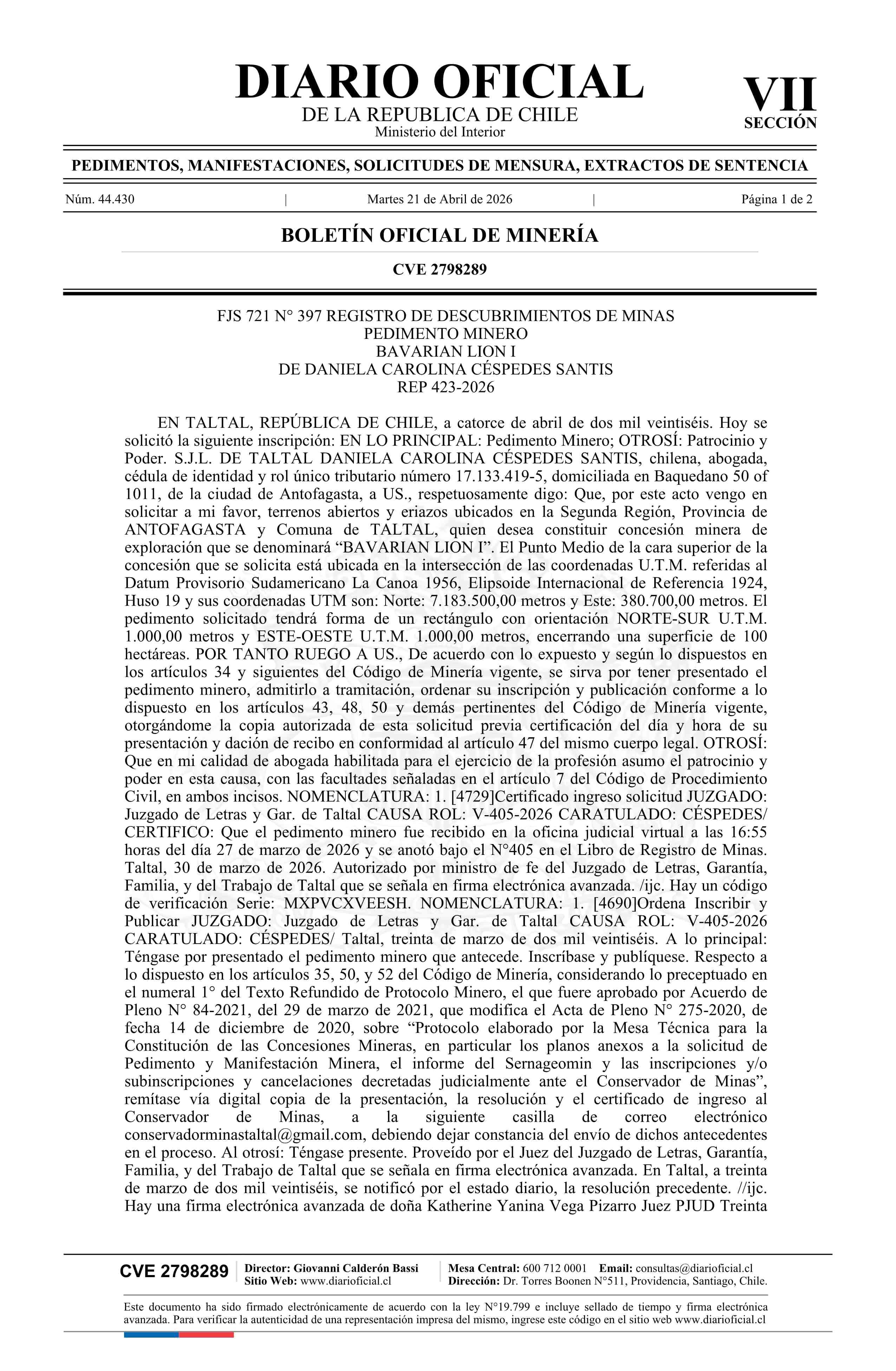 21-04-2026 DIARIO OFICIAL CHILE - BOLETÍN OFICIAL DE MINERÍA