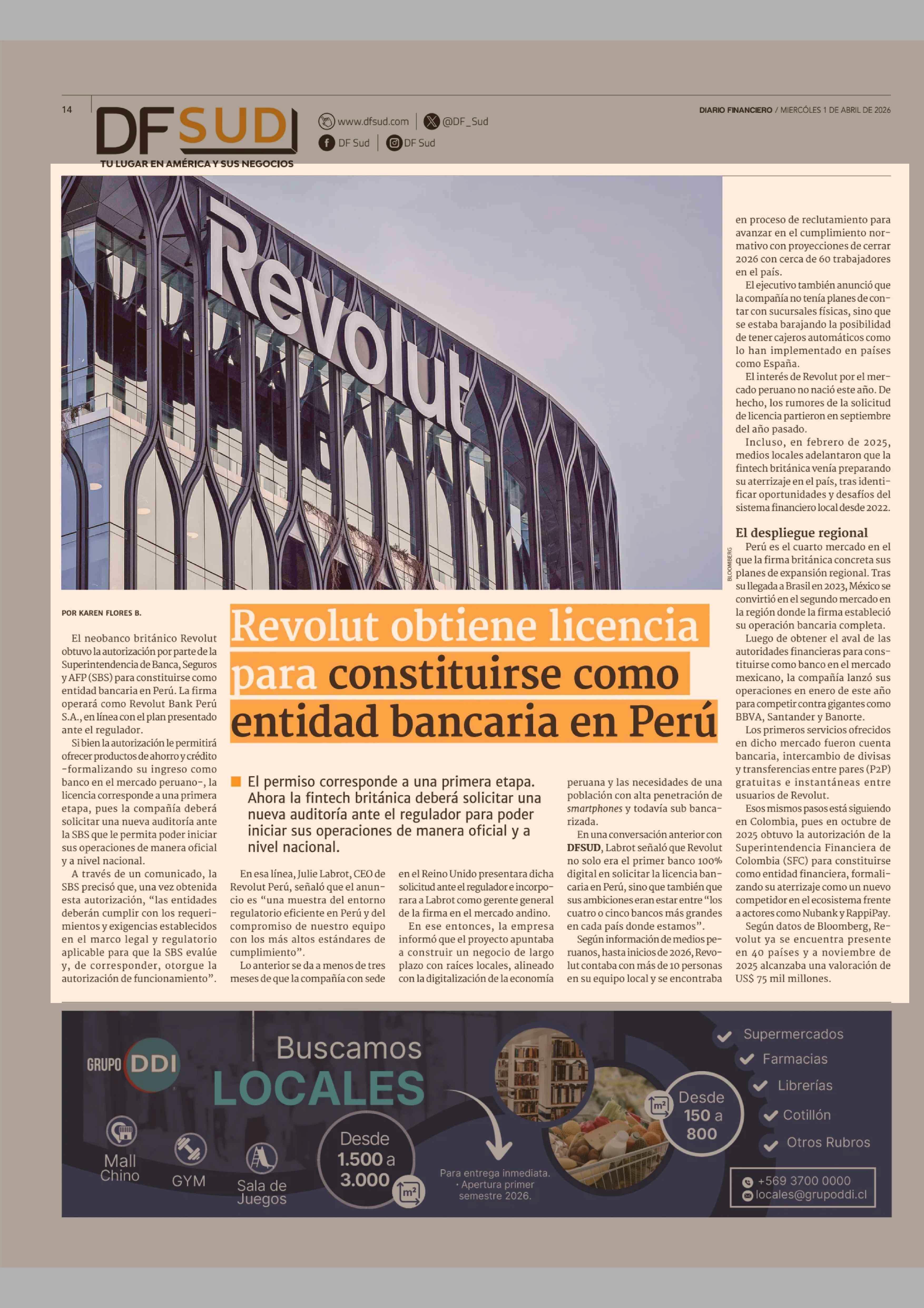 Revolut obtiene licencia para constituirse como entidad bancaria en Perú 01-04-2026 Diario Financiero |