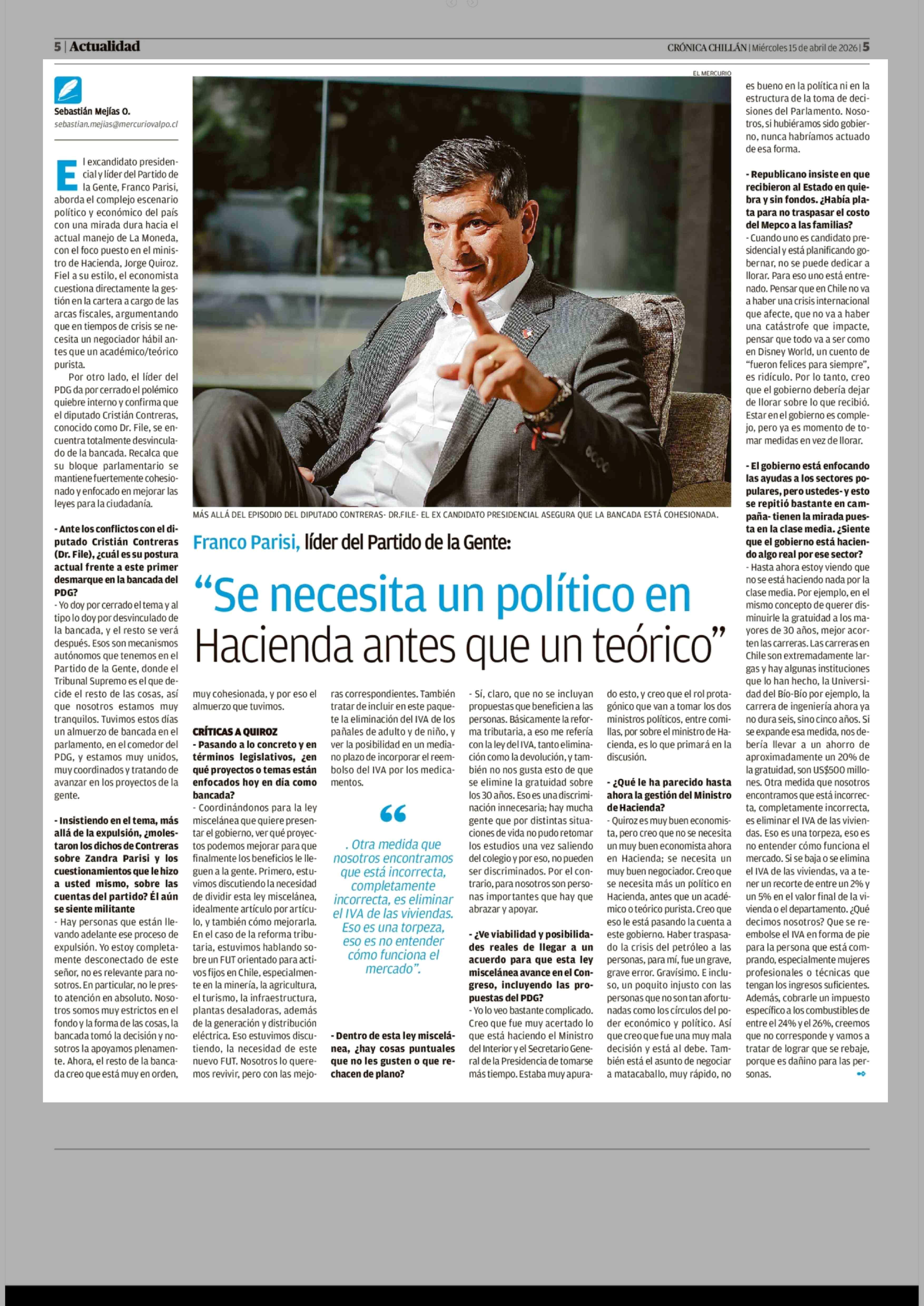 "Se necesita un político en Hacienda antes que un teórico" 15-04-2026 Crónica de Chillán |