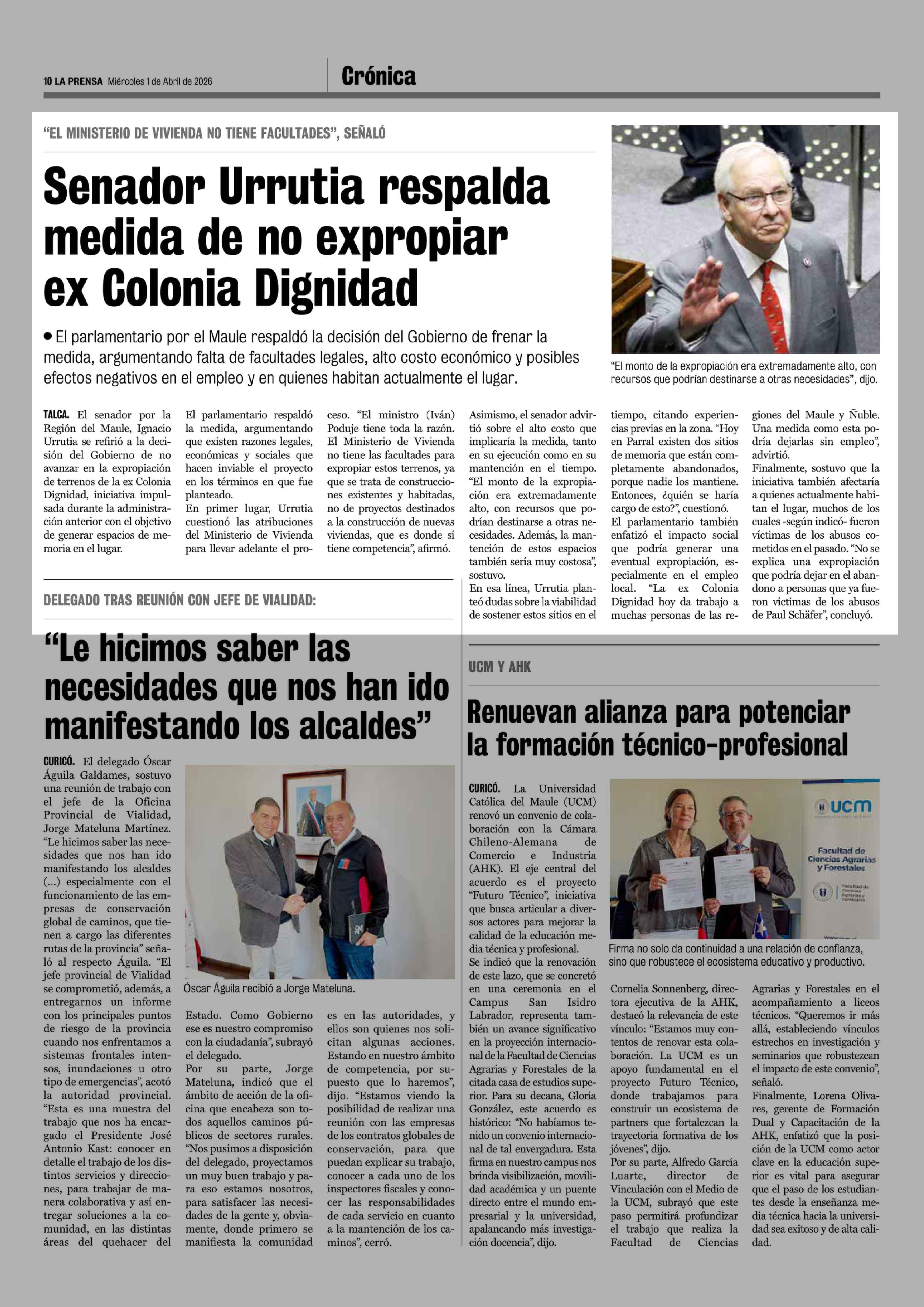 Senador Urrutia respalda medida de no expropiar ex Colonia Dignidad 01-04-2026 La Prensa de Curicó |