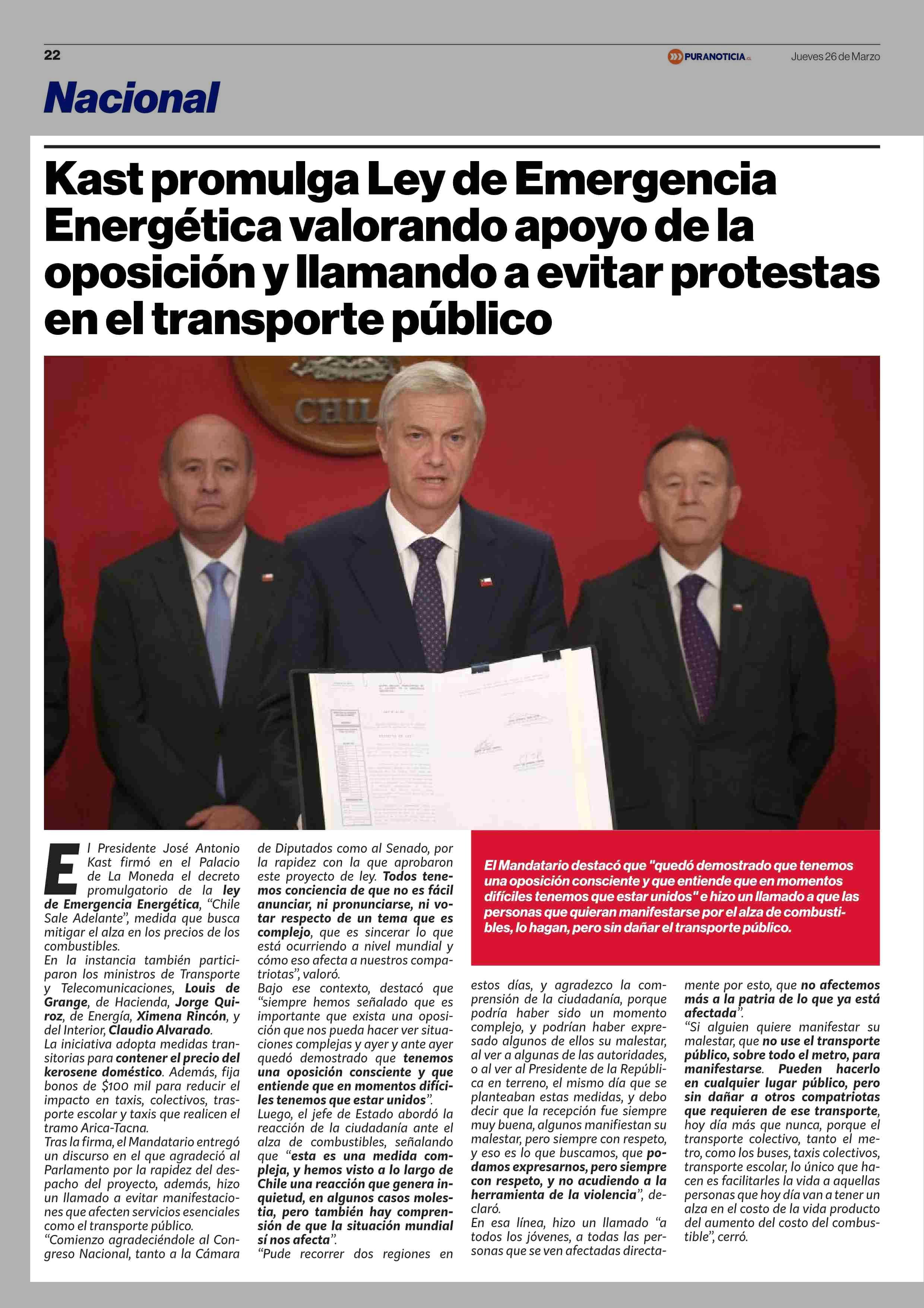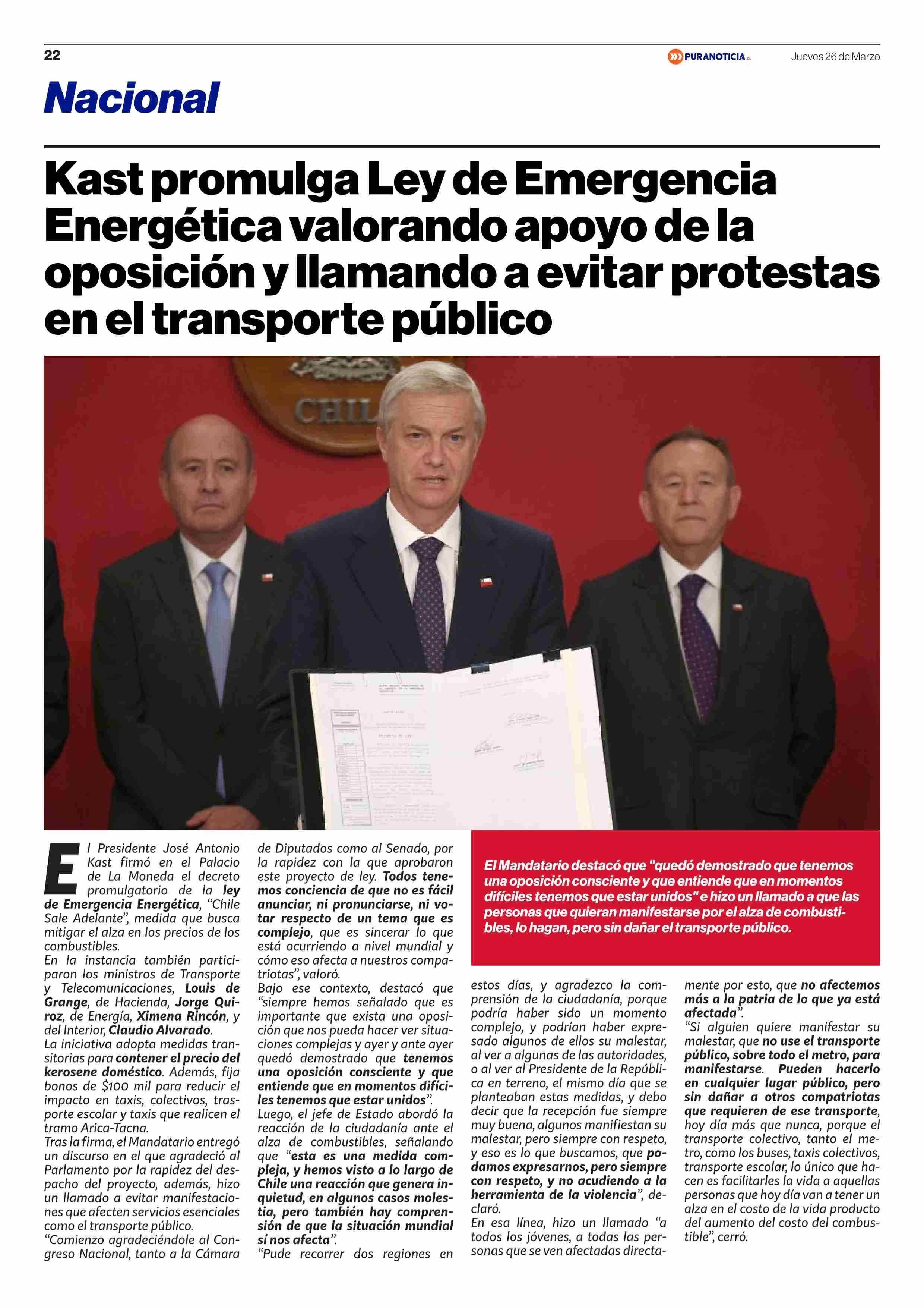 Kast promulga Ley de Emergencia Energética valorando apoyo de la oposición y llamando a evitar protestas en el transporte público 26-03-2026 Puranoticia.cl |