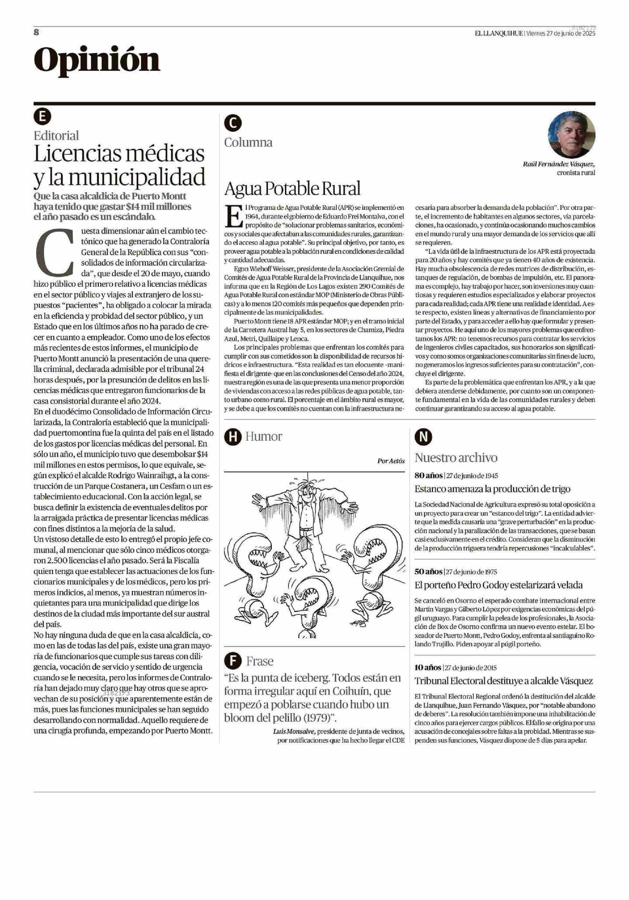 Columnas de Opinión: Agua Potable Rural 27-06-2025 El Llanquihue |