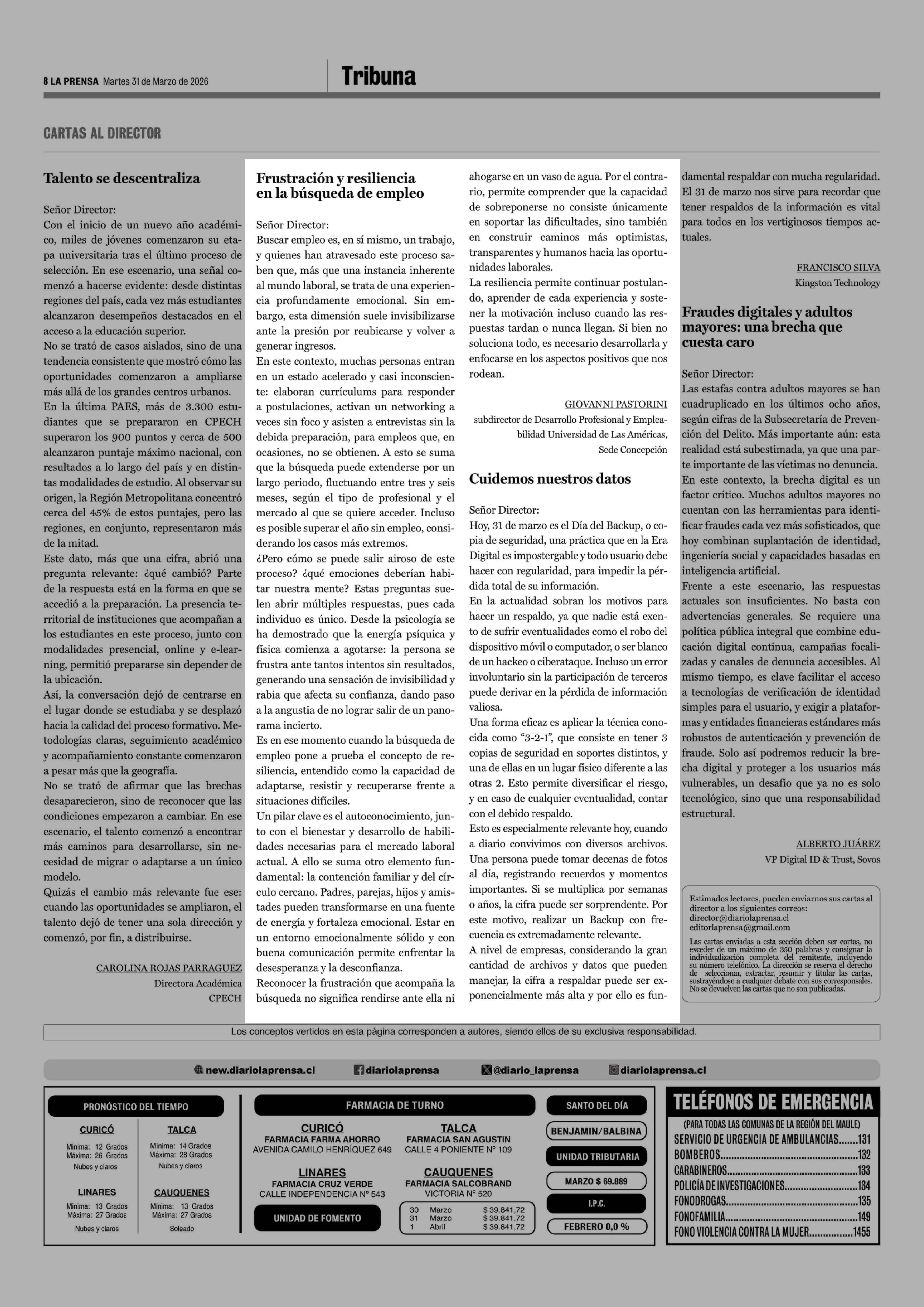 Cartas: Frustración y resiliencia en la búsqueda de empleo 31-03-2026 La Prensa de Curicó |