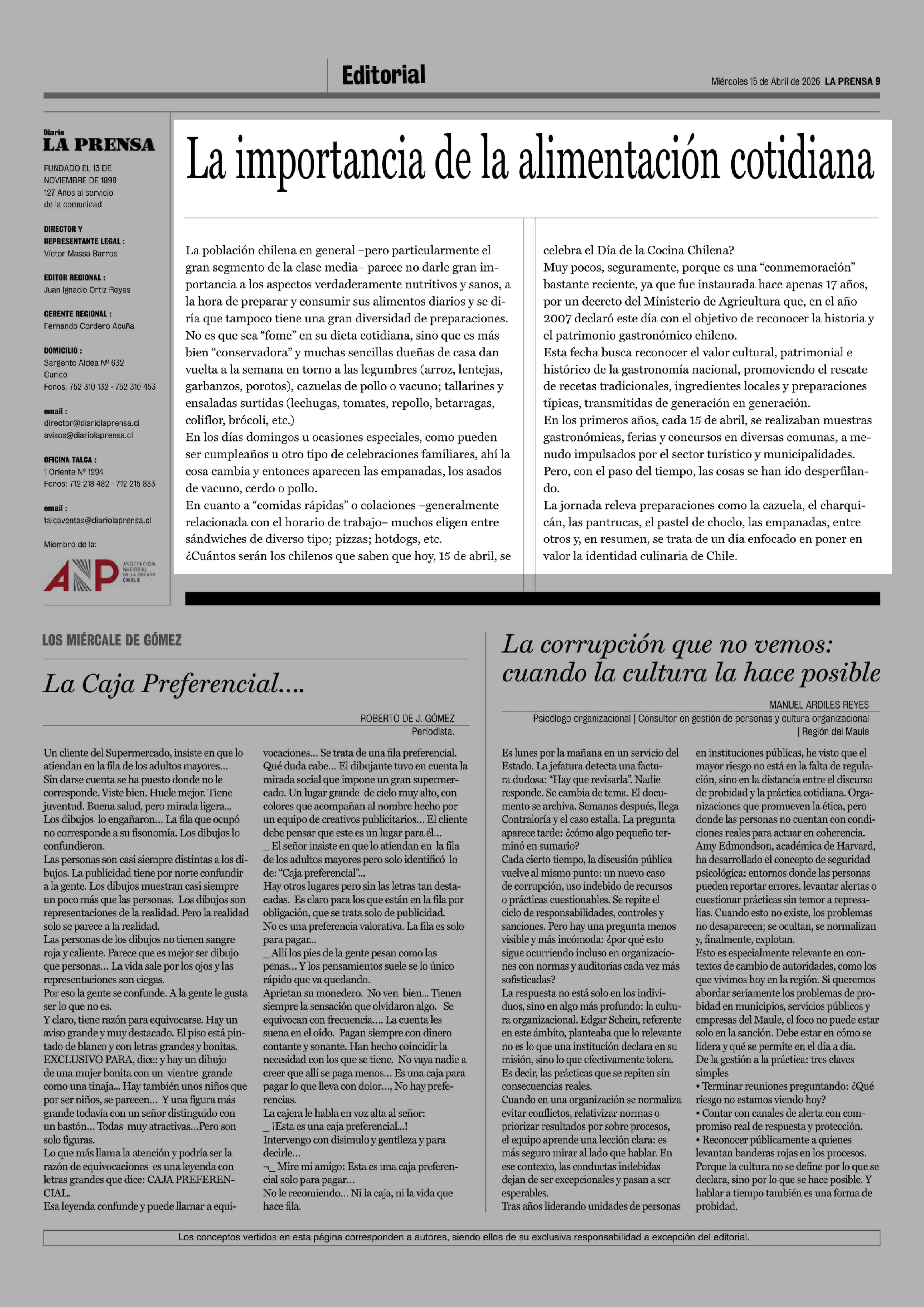 Editorial: La importancia de la alimentación cotidiana 15-04-2026 La Prensa de Curicó |