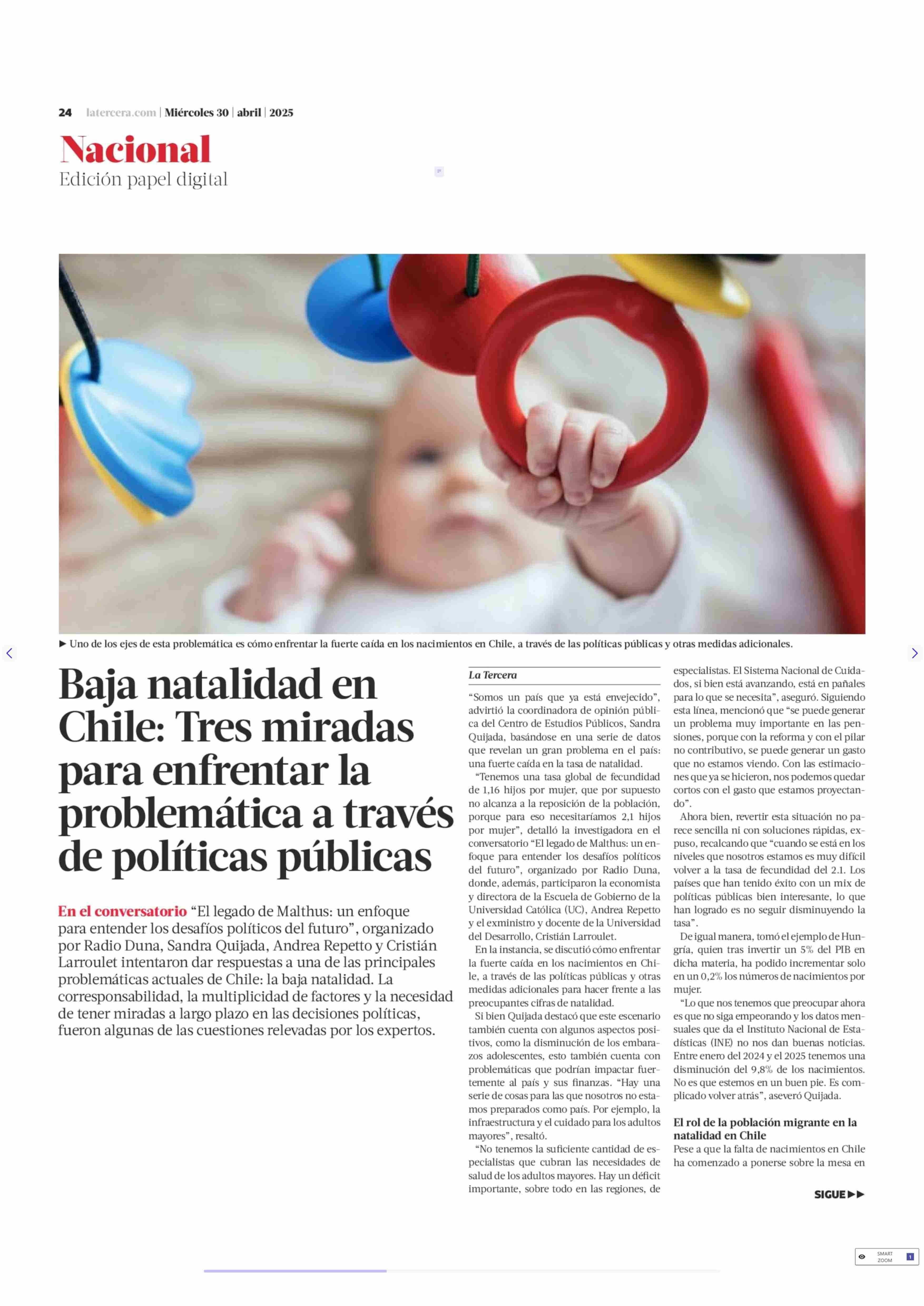 Baja natalidad en Chile: Tres miradas para enfrentar la problemática a través de políticas públicas 30-04-2025 La Tercera |
