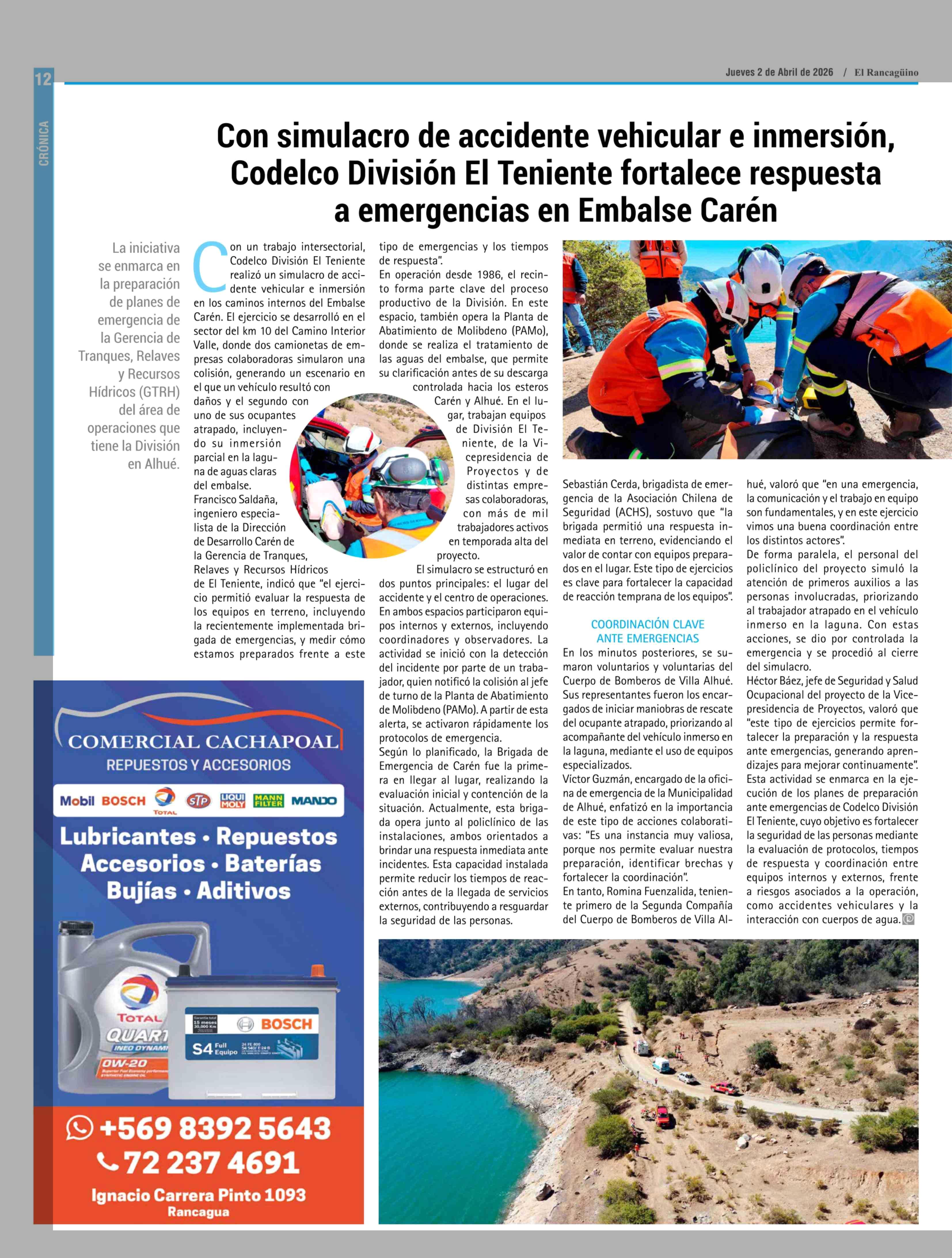 Con simulacro de accidente vehicular e inmersión, Codelco División El Teniente fortalece respuesta a emergencias en Embalse Carén 02-04-2026 El Rancagüino |