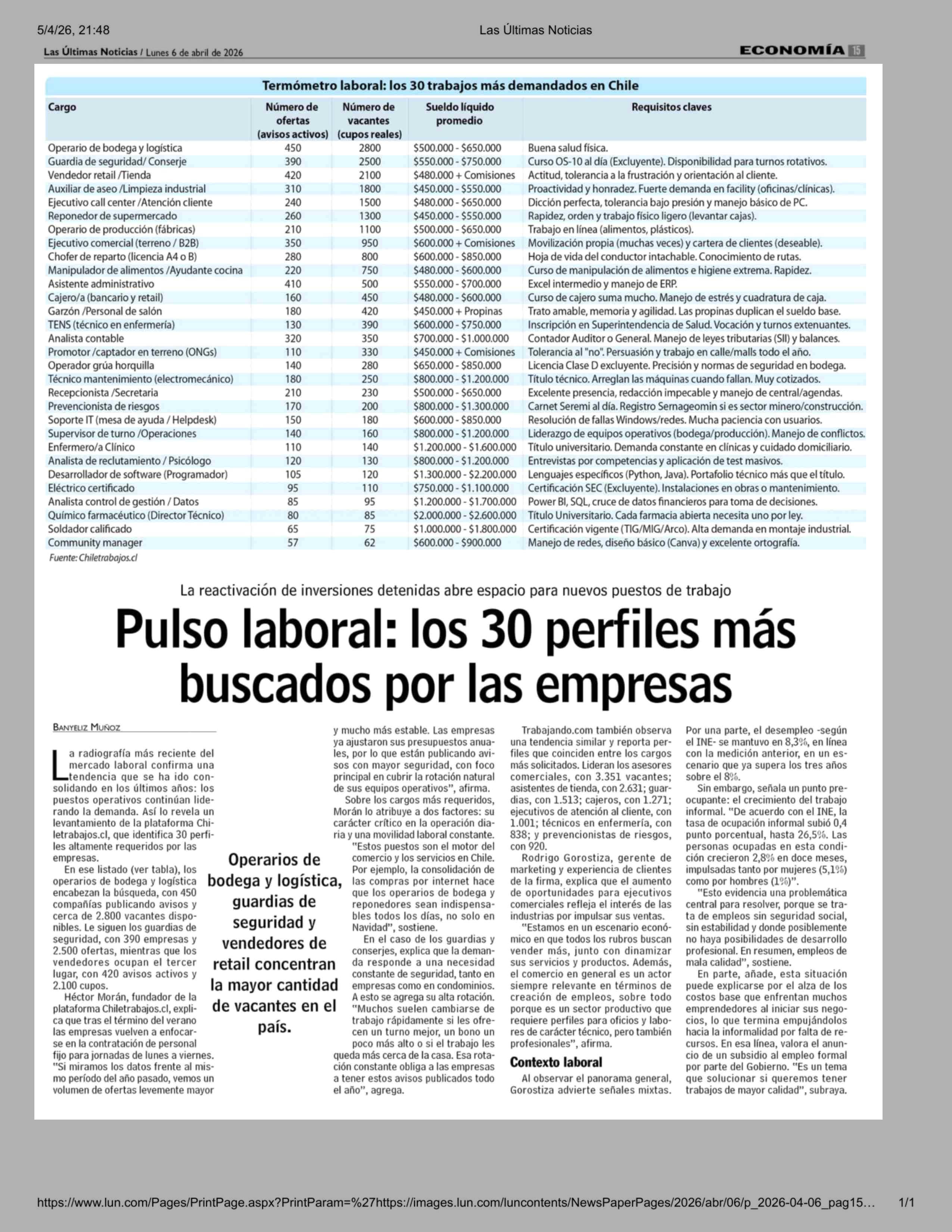 Pulso laboral: los 30 perfiles más buscados por las empresas 06-04-2026 Las Últimas Noticias |