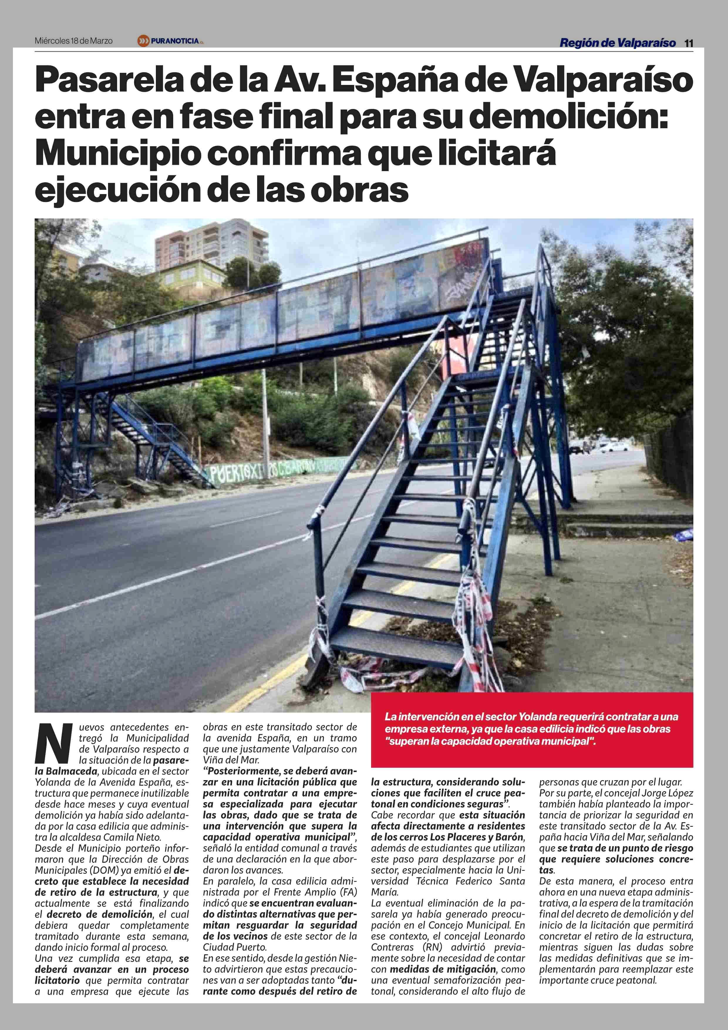 Pasarela de la Av. España de Valparaíso entra en fase final para su demolición: Municipio confirma que licitará ejecución de las obras 18-03-2026 Puranoticia.cl |