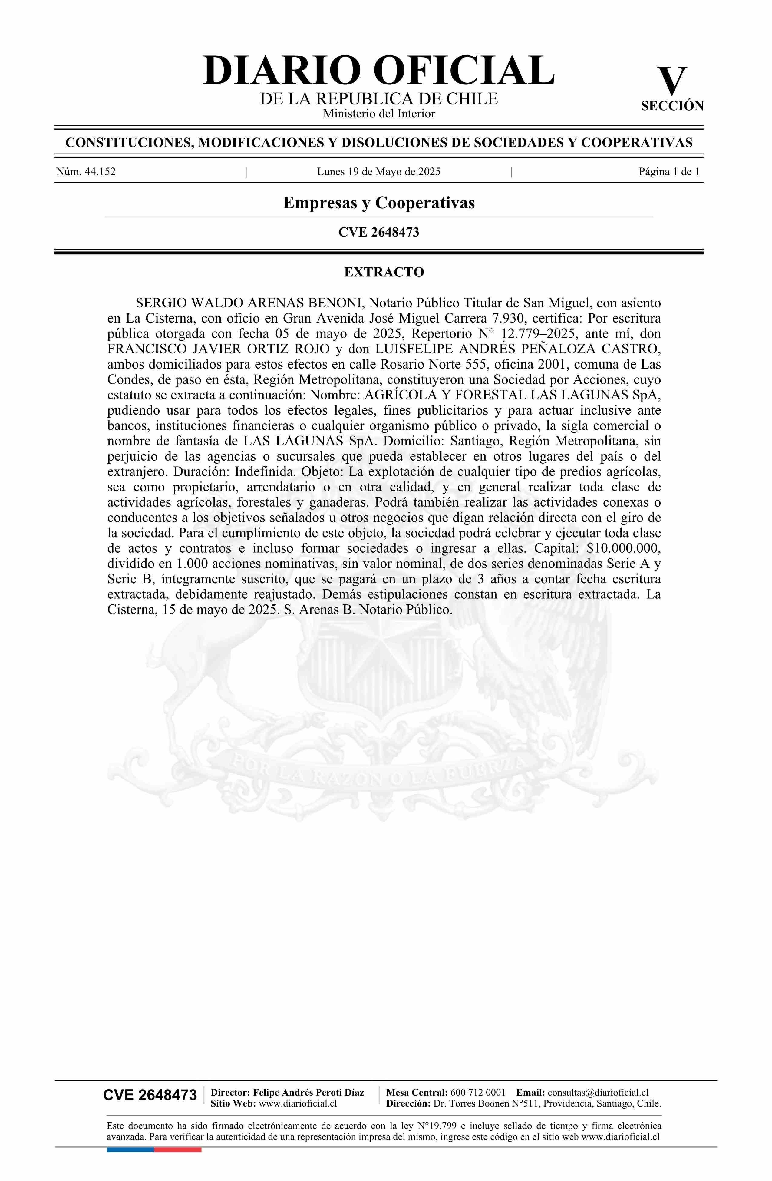 AGRÍCOLA Y FORESTAL LAS LAGUNAS SpA 19-05-2025 Diario Oficial Edición Electrónica |