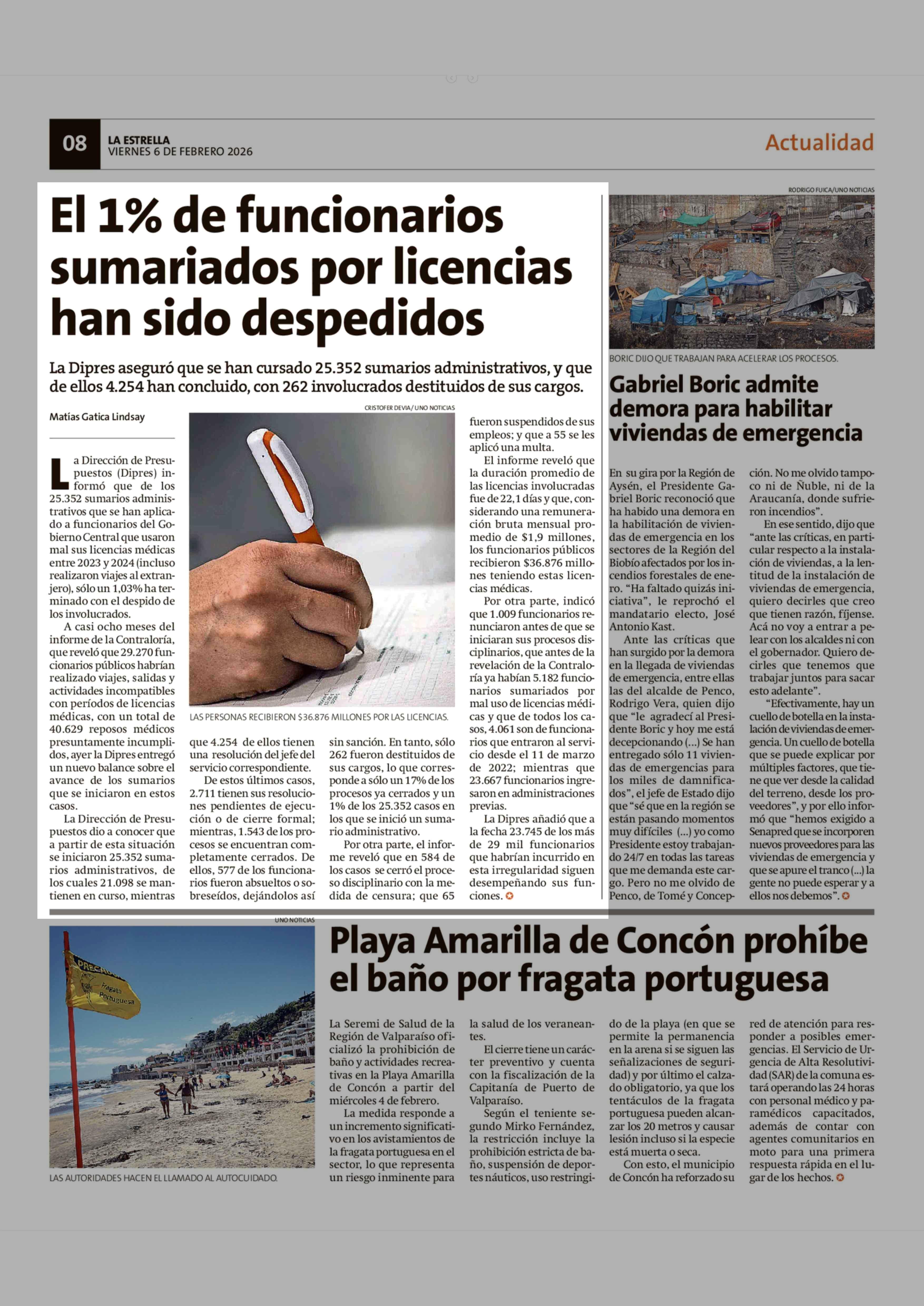 El 1% de funcionarios sumariados por licencias han sido despedidos 06-02-2026 La Estrella de Valparaíso |