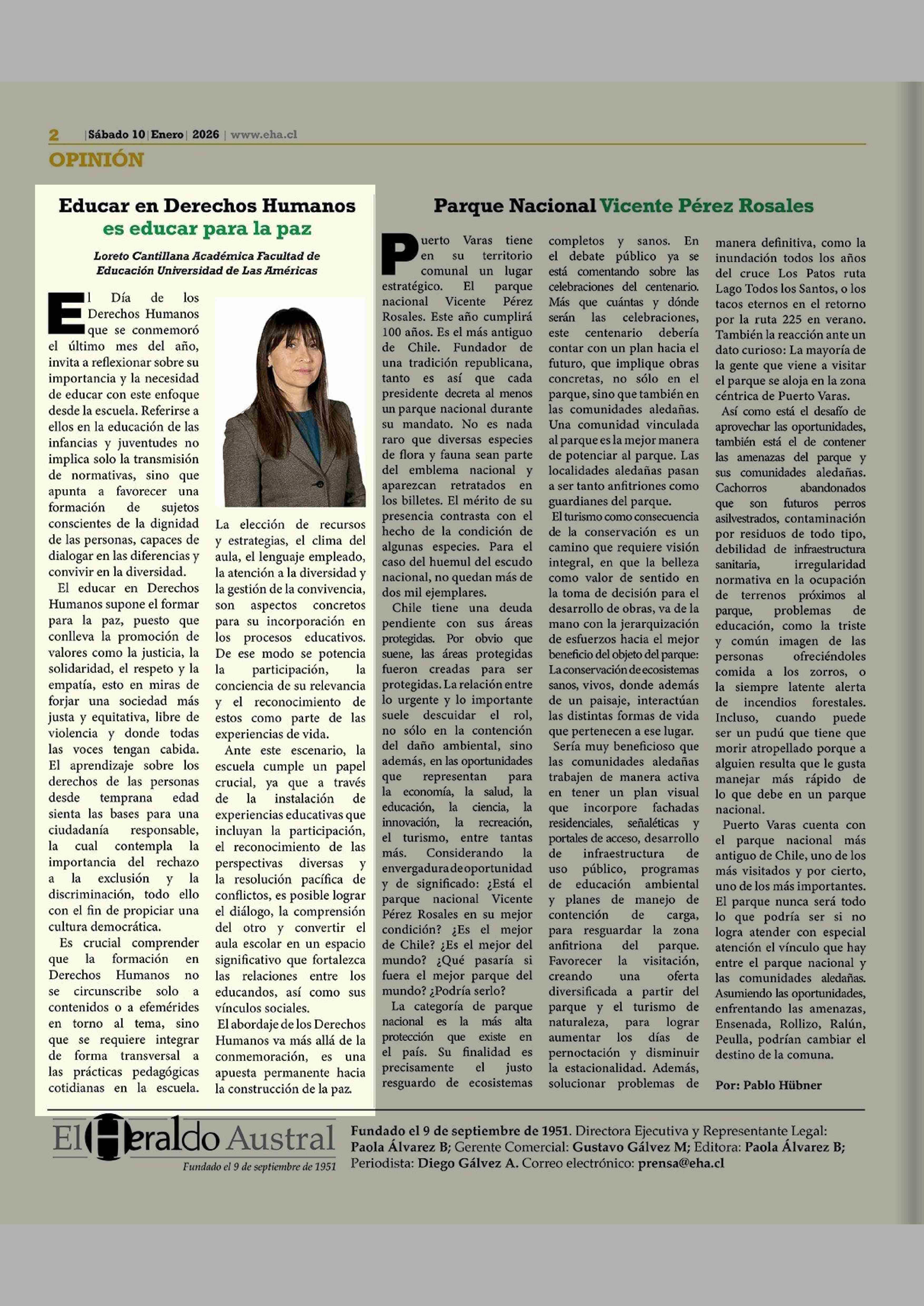 Columnas de Opinión: Educar en Derechos Humanos es educar para la paz 10-01-2026 El Heraldo Austral |