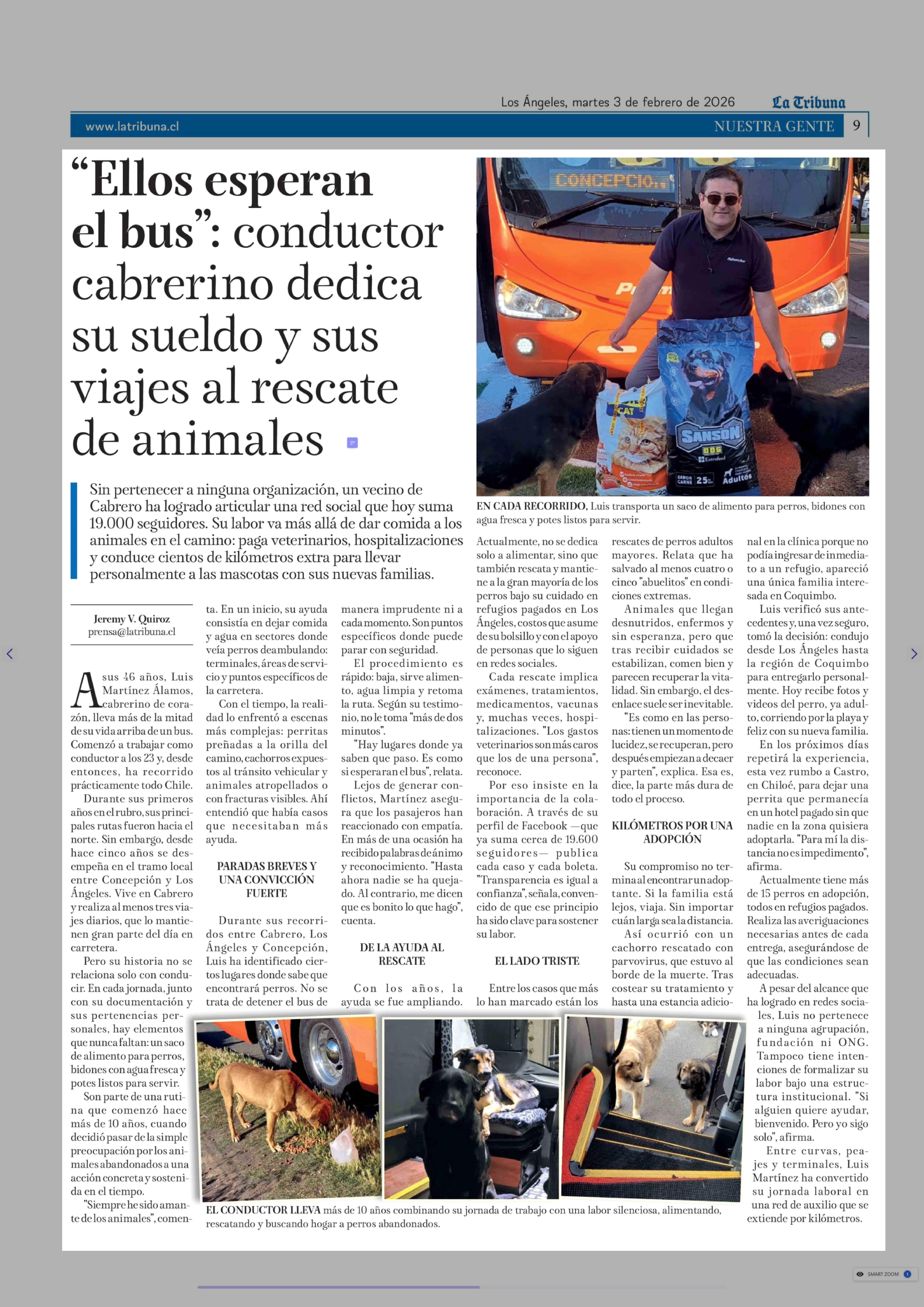 Título: "Ellos esperan el bus": conductor cabrerino dedica su sueldo y sus viajes al rescate de animales