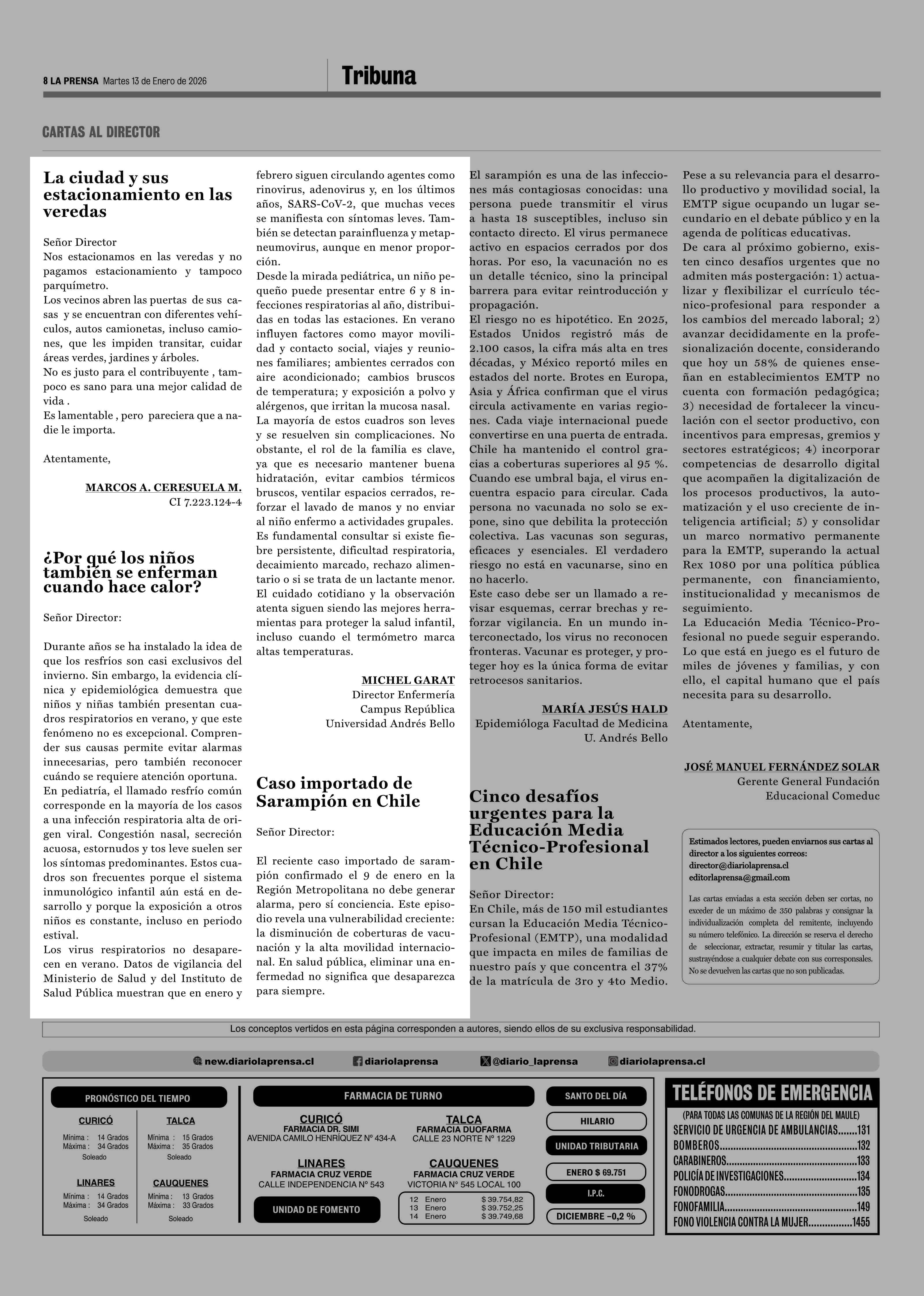 Cartas: ¿Por qué los niños tambien se enferman cuando hace calor? 13-01-2026 La Prensa de Curicó |