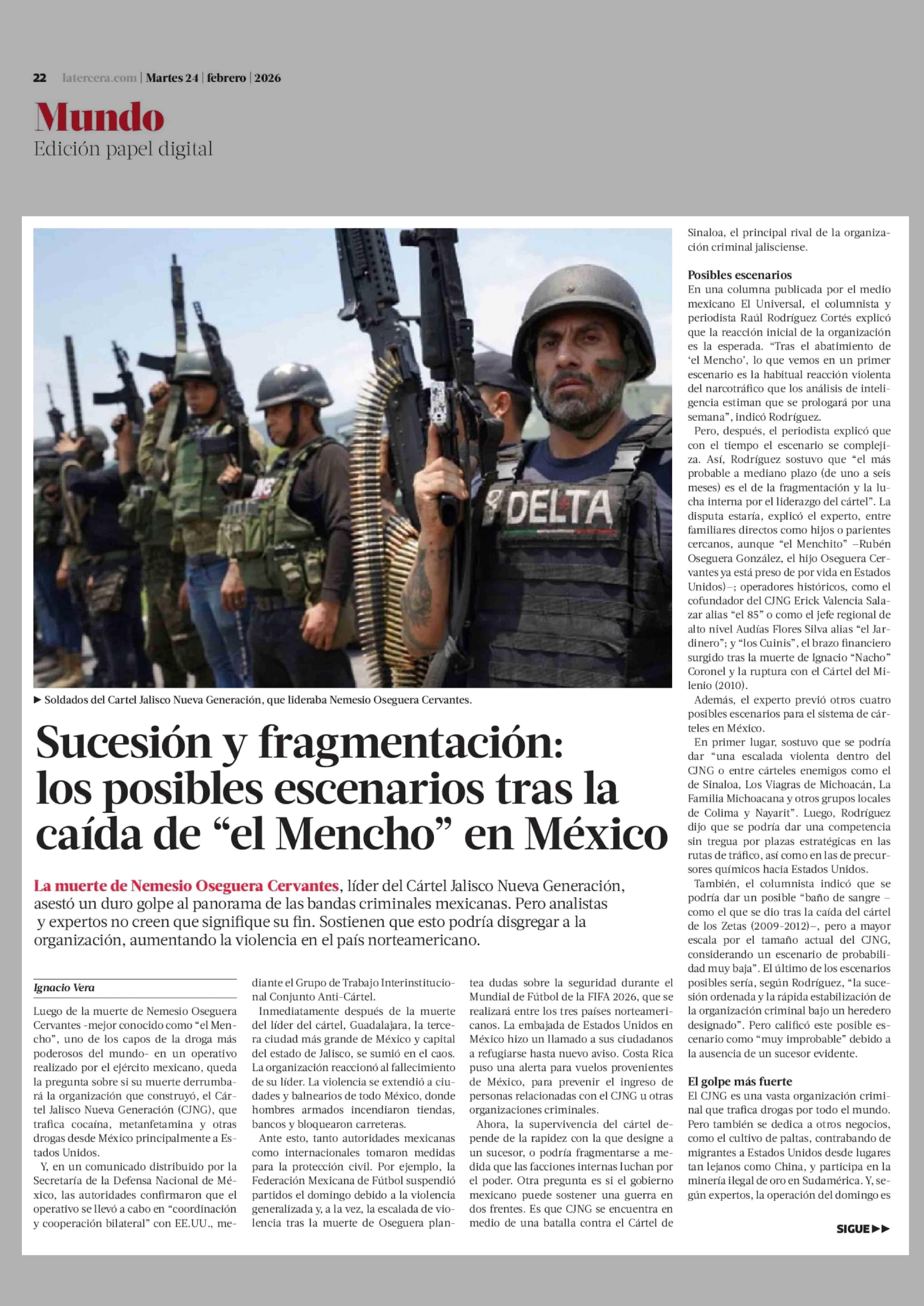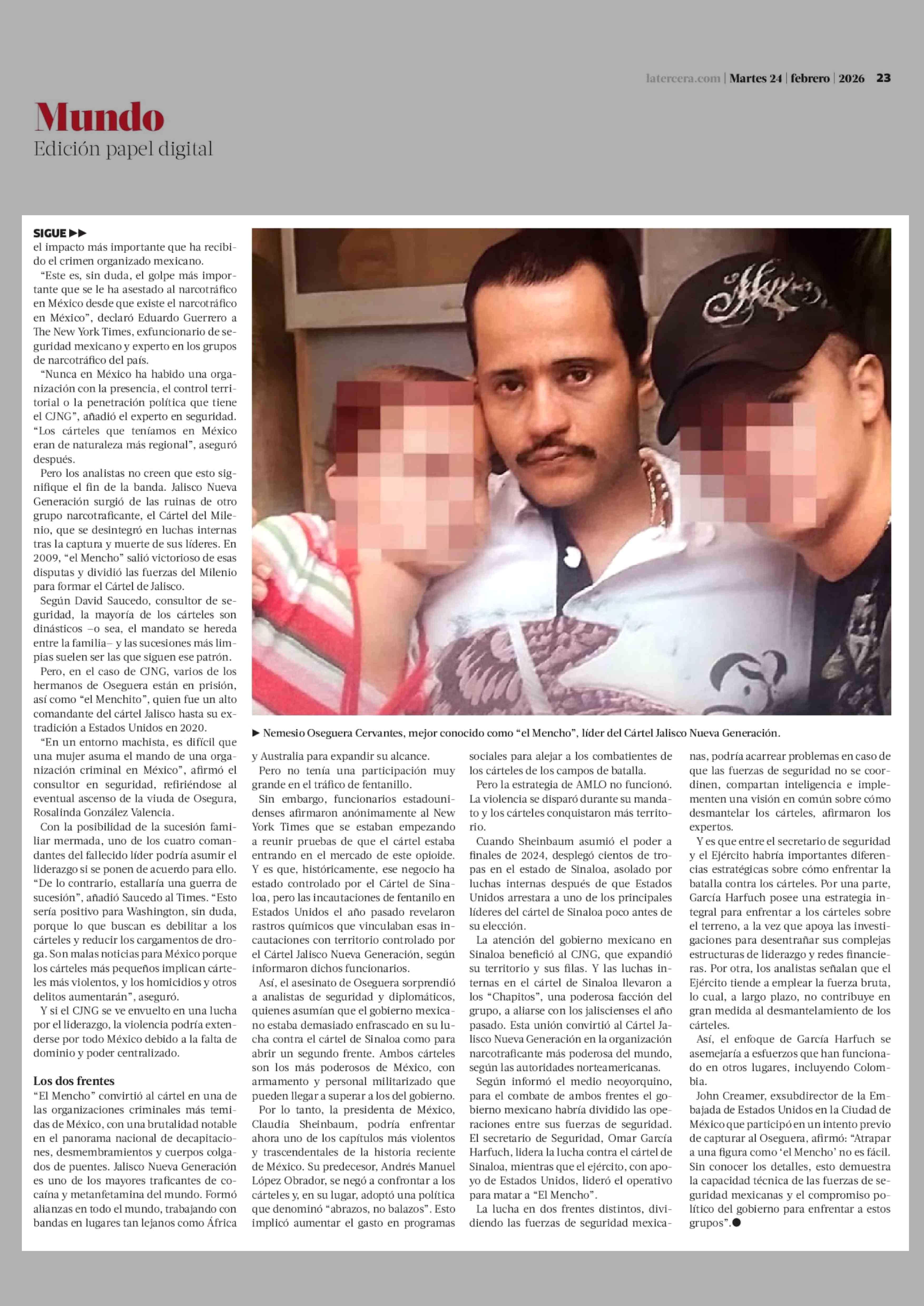 Sucesión y fragmentación: los posibles escenarios tras la caída de "el Mencho" en México 24-02-2026 La Tercera |