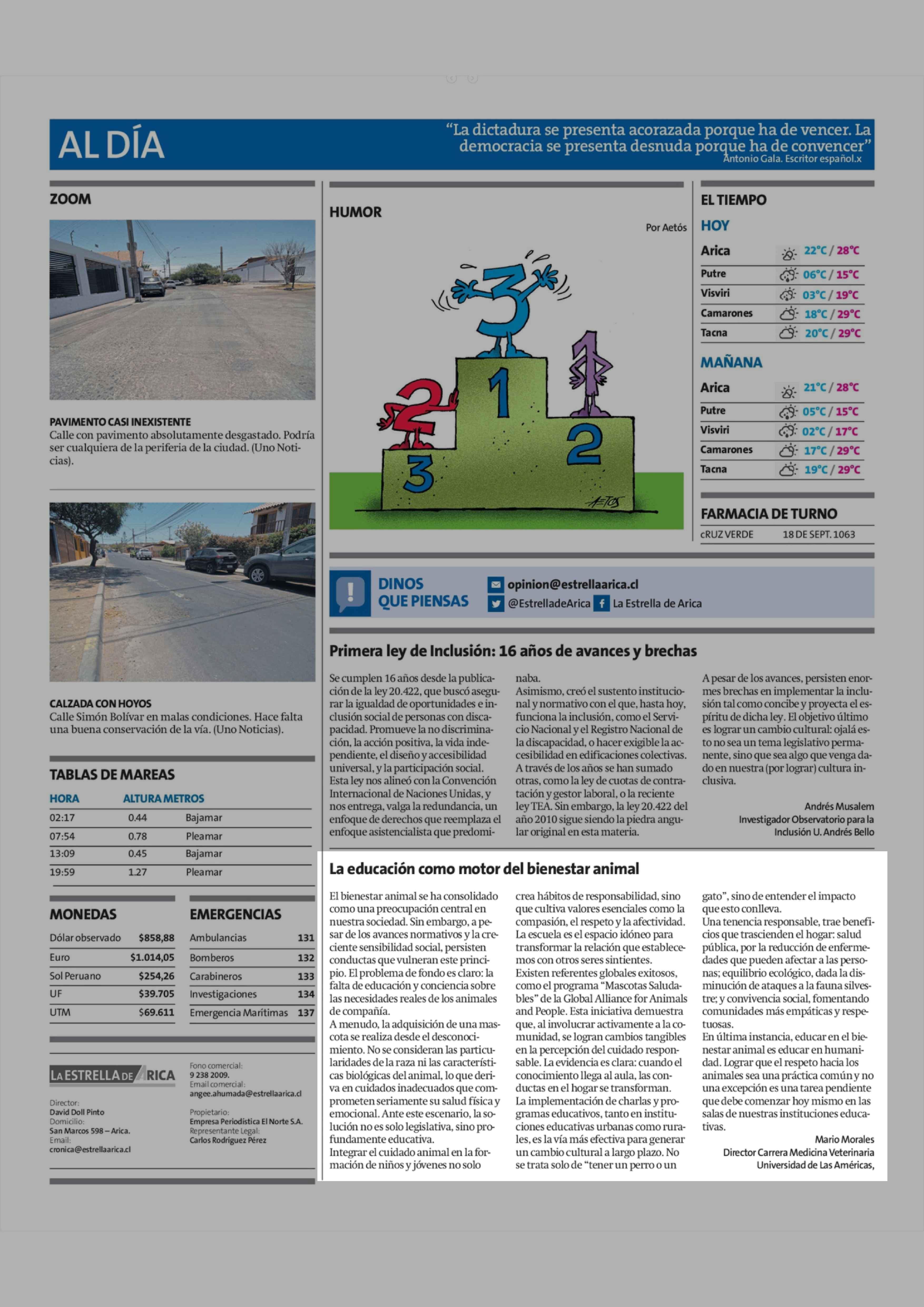 Columnas de Opinión: La educación como motor del bienestar animal 14-02-2026 La Estrella de Arica |