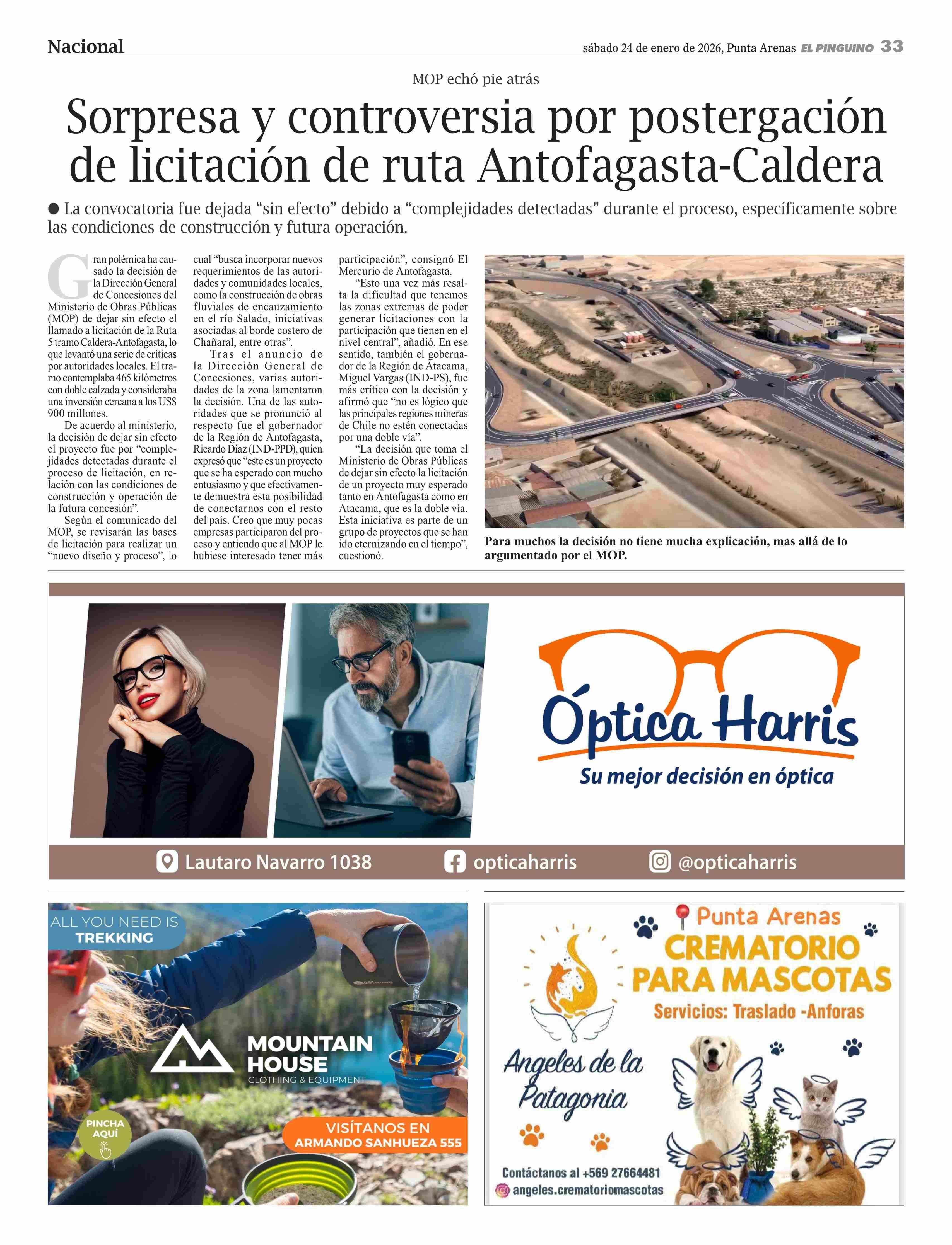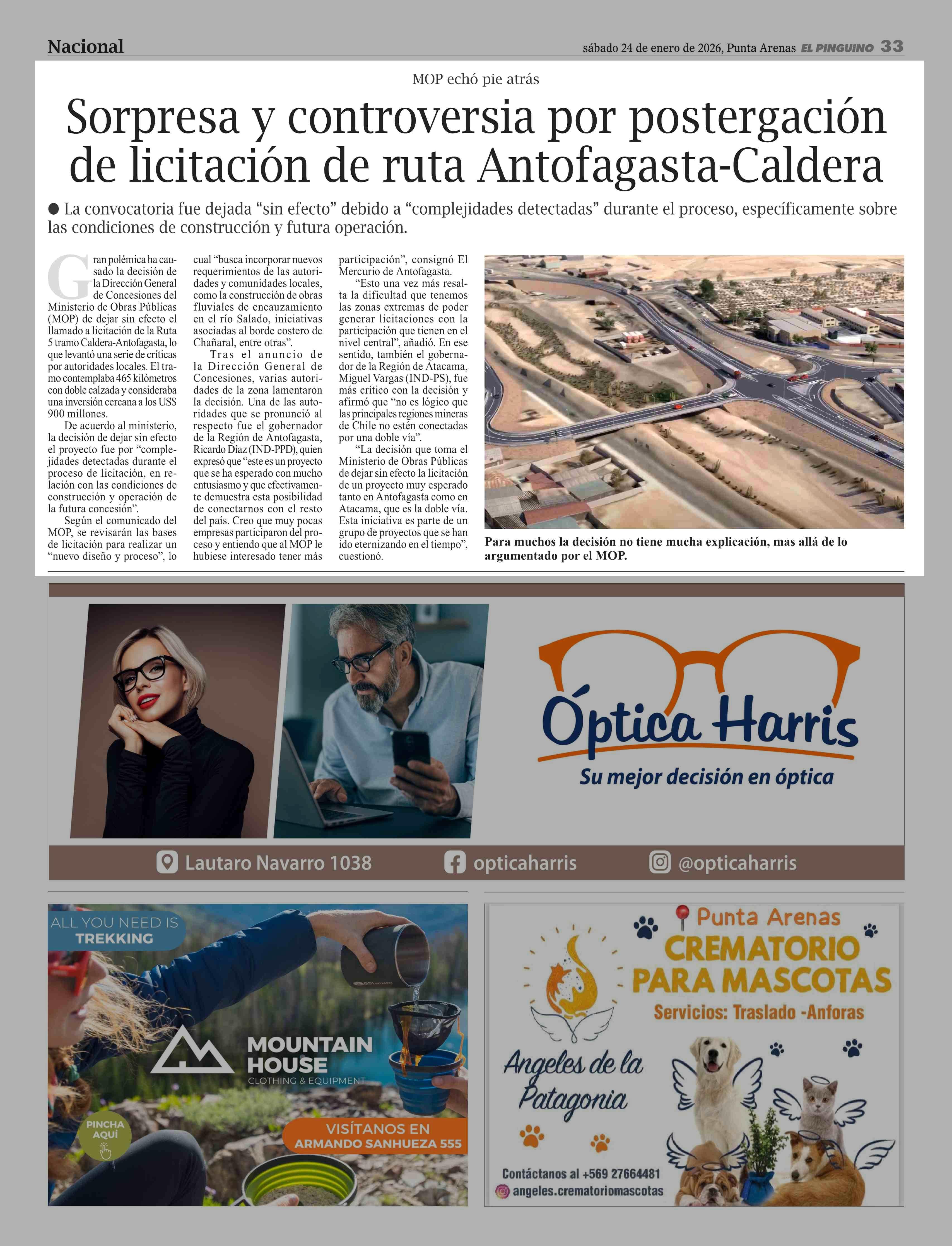 Sorpresa y controversia por postergación de licitación de ruta Antofagasta-Caldera 24-01-2026 El Pingüino |