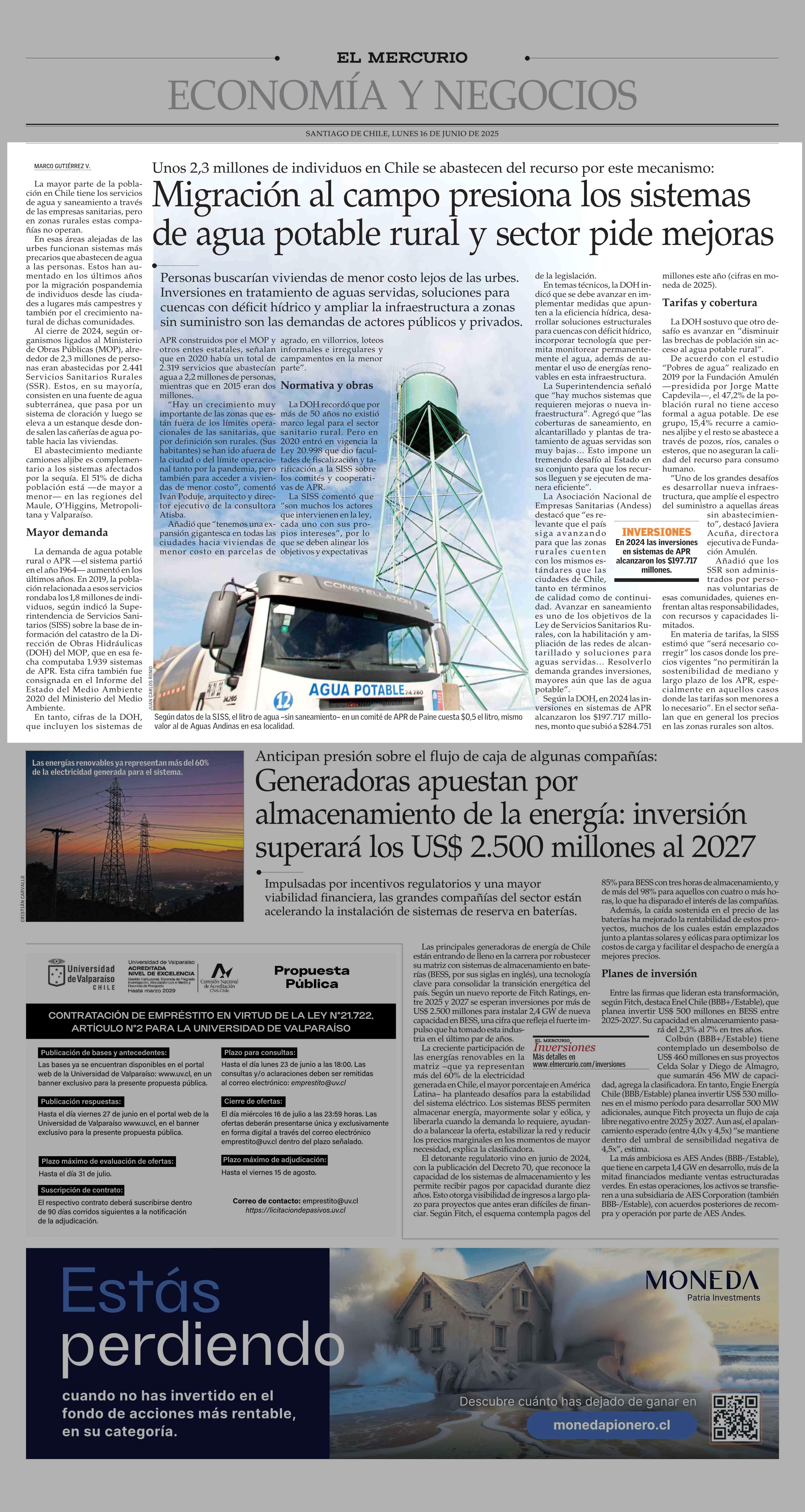 Migración al campo presiona los sistemas de agua potable rural y sector pide mejoras 16-06-2025 El Mercurio |
