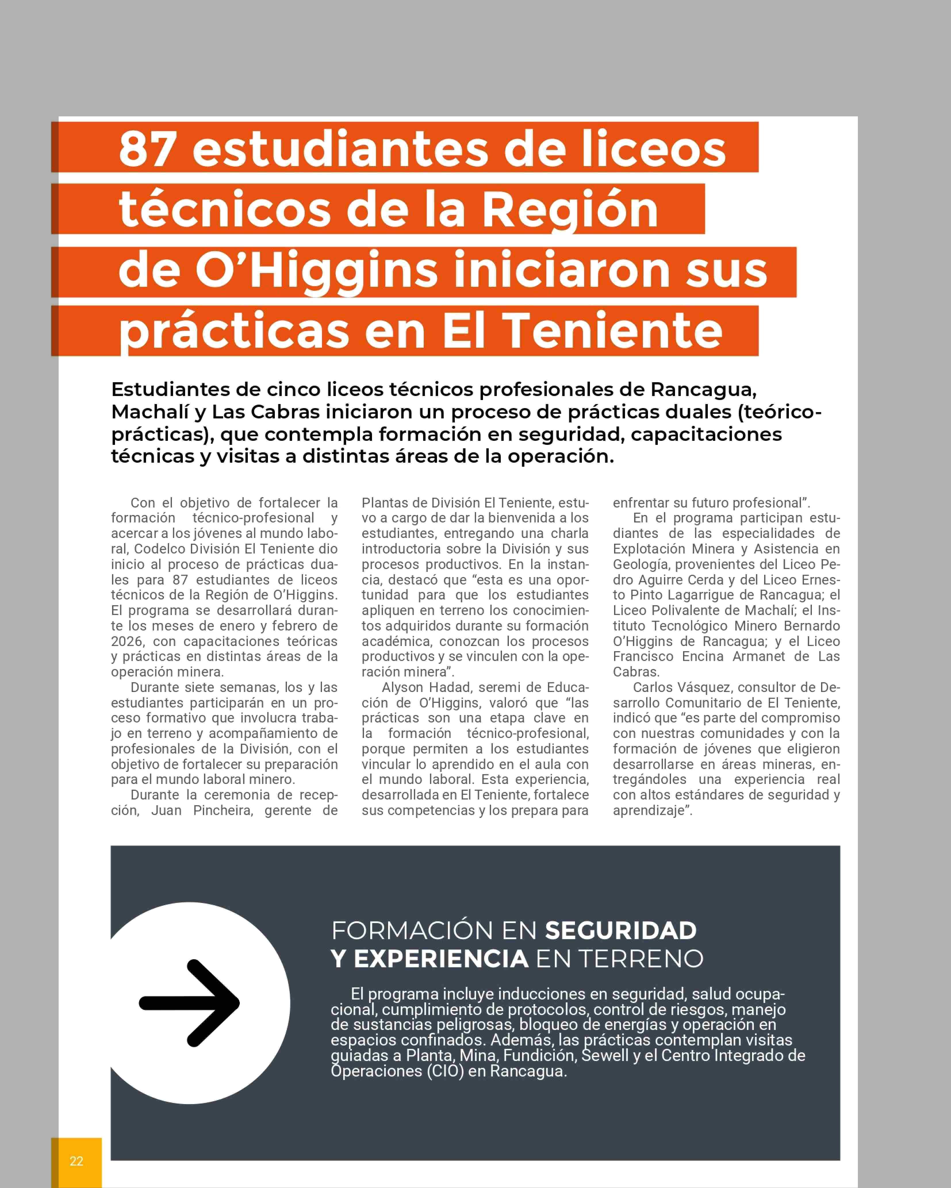 | Título: | 87 Estudiantes de liceos técnicos de la Región de O'Higgins iniciaron sus prácticas en El Teniente |